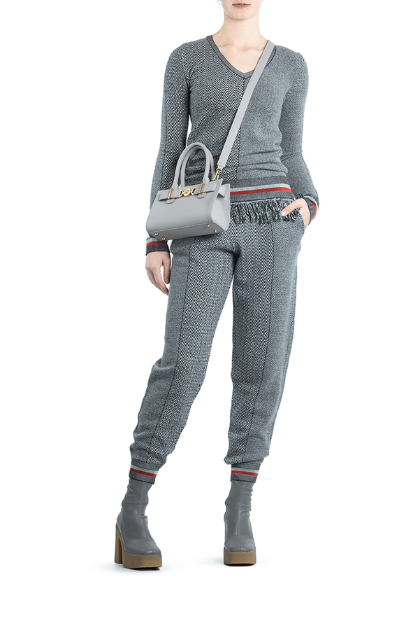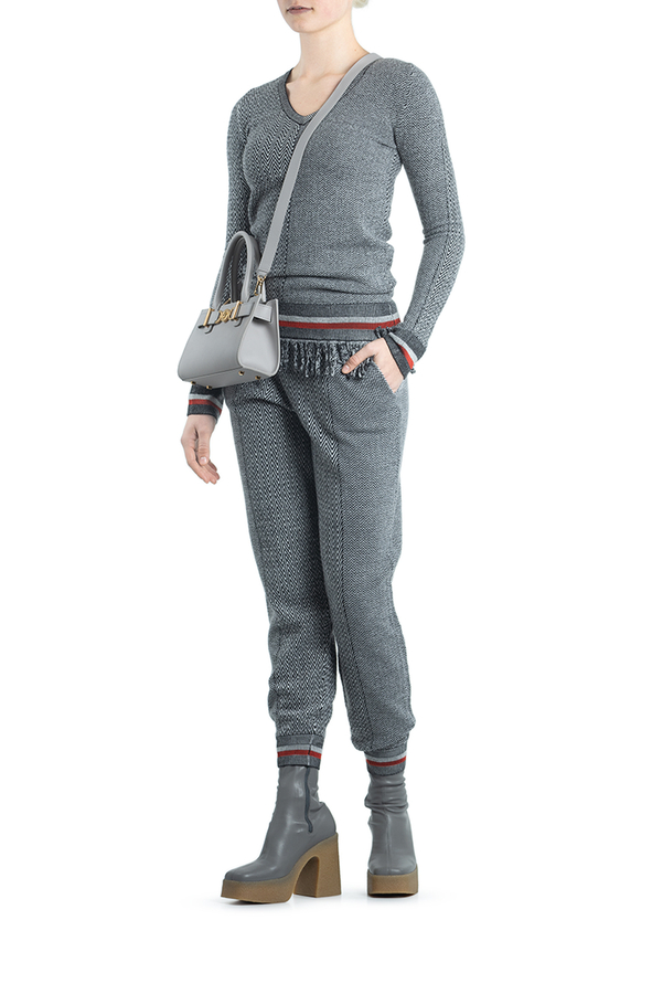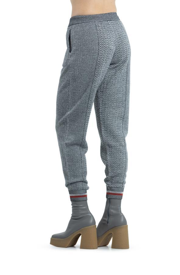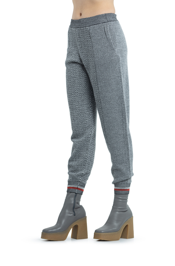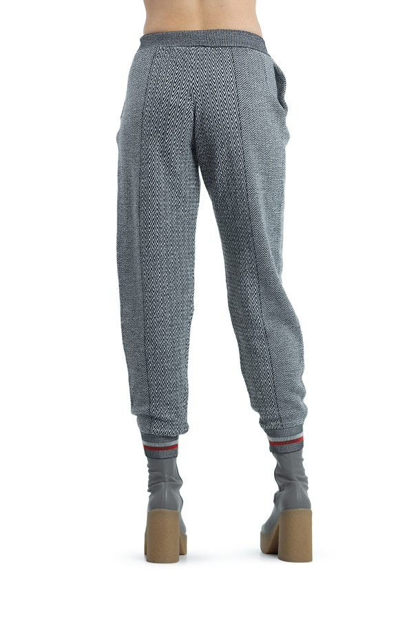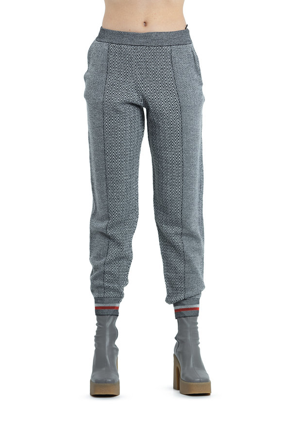 - Спортивні штани з чорно-білим патерном зіг-загу. З червоною смужкою на еластичних манжетах.