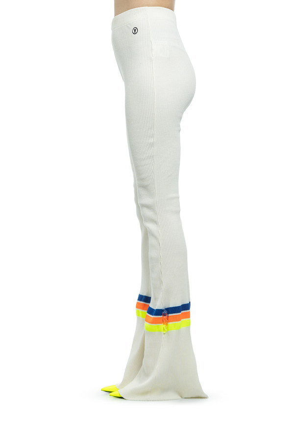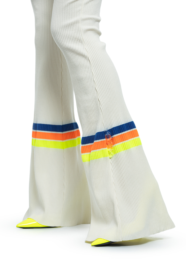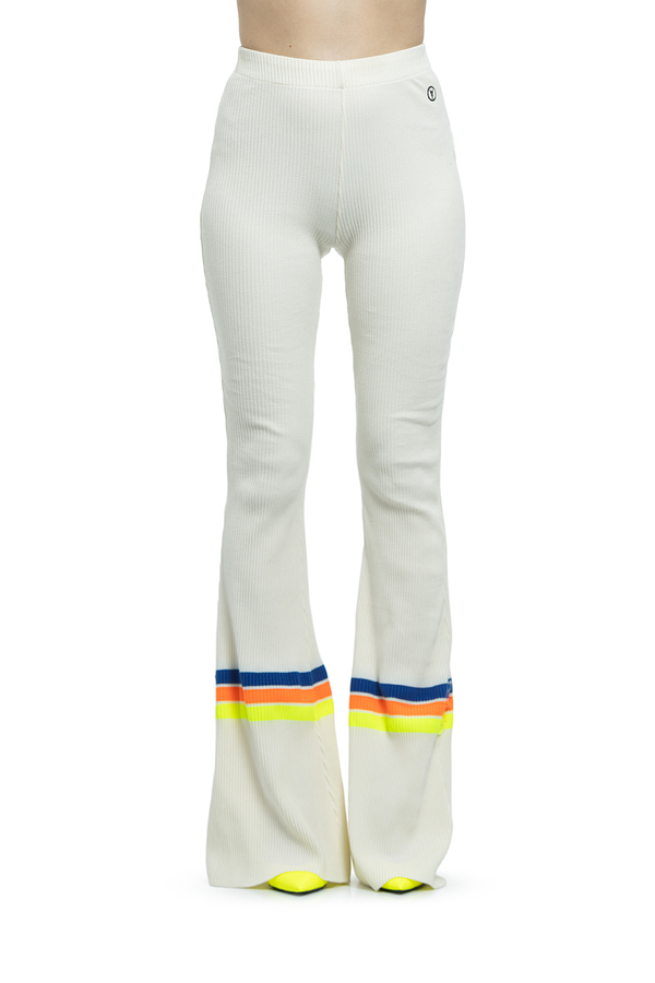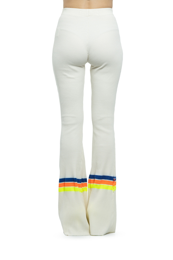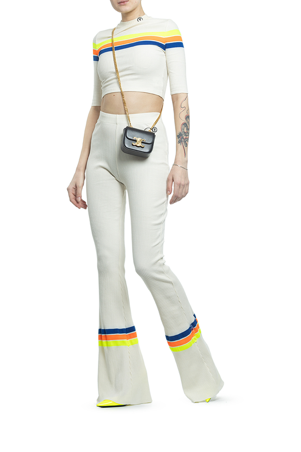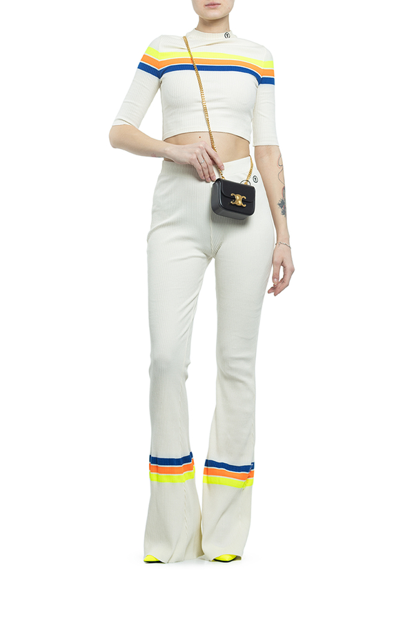 - Трикотажні штани-кльош прикрашені кольоровими смужками.