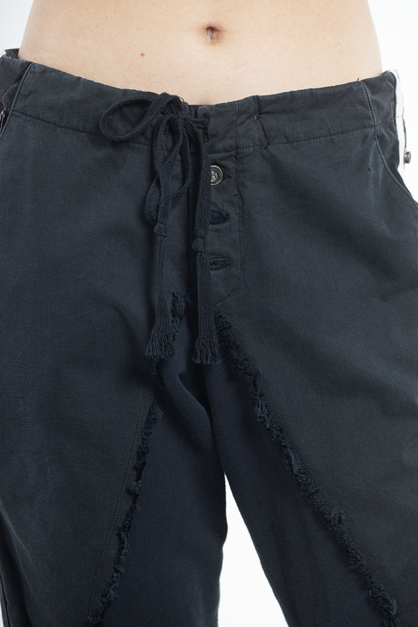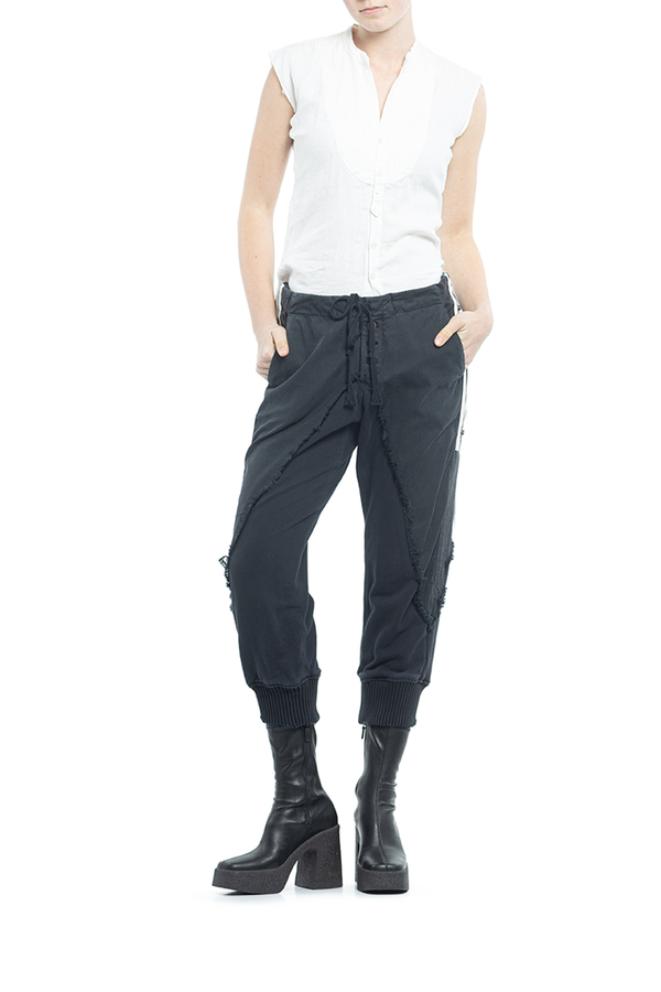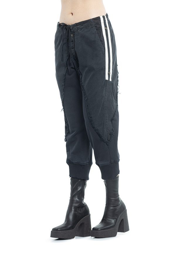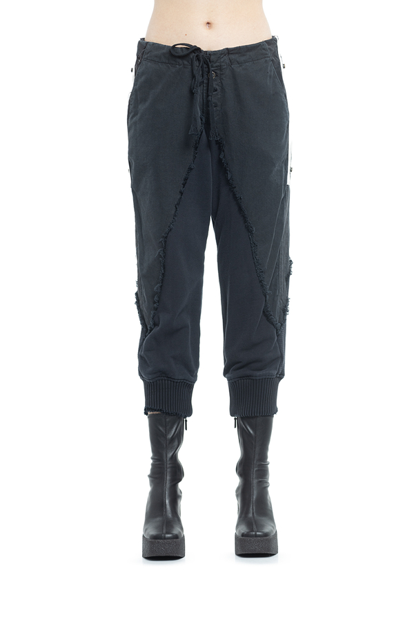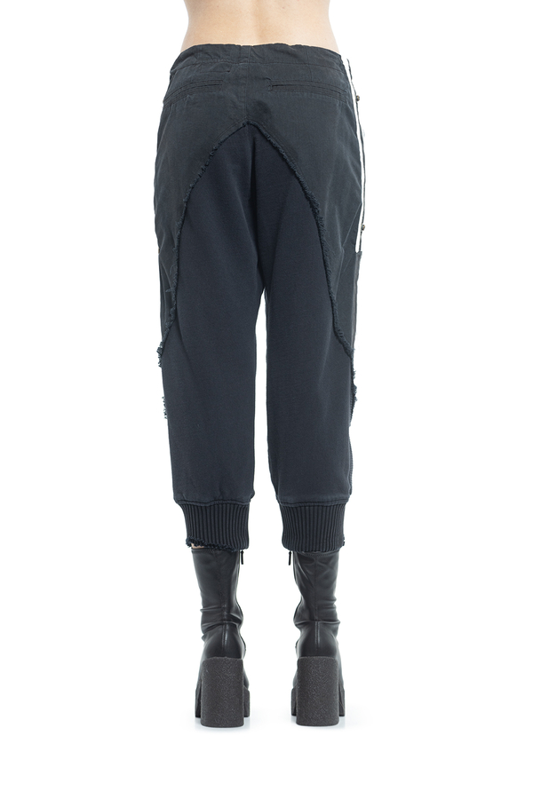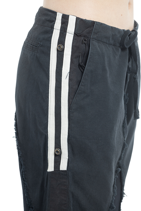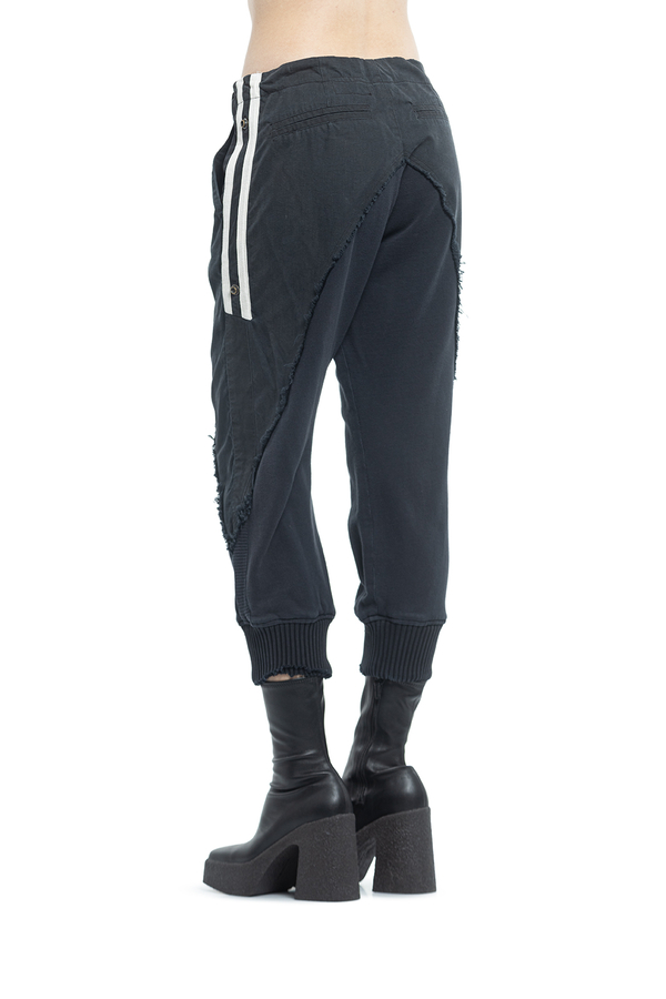 - Бавовняні спортивні штани з лампасами з боків і на еластичному поясі з куліскою. Двуколірний дизайн, низький шаговий шов.