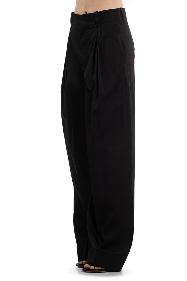 - Штани з ефектом плісе спереду, на поясі шлевки для ременя, дві кишені у бокових швах, прихована блискавка та застібка на гачок