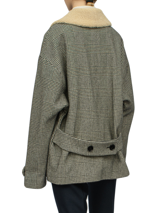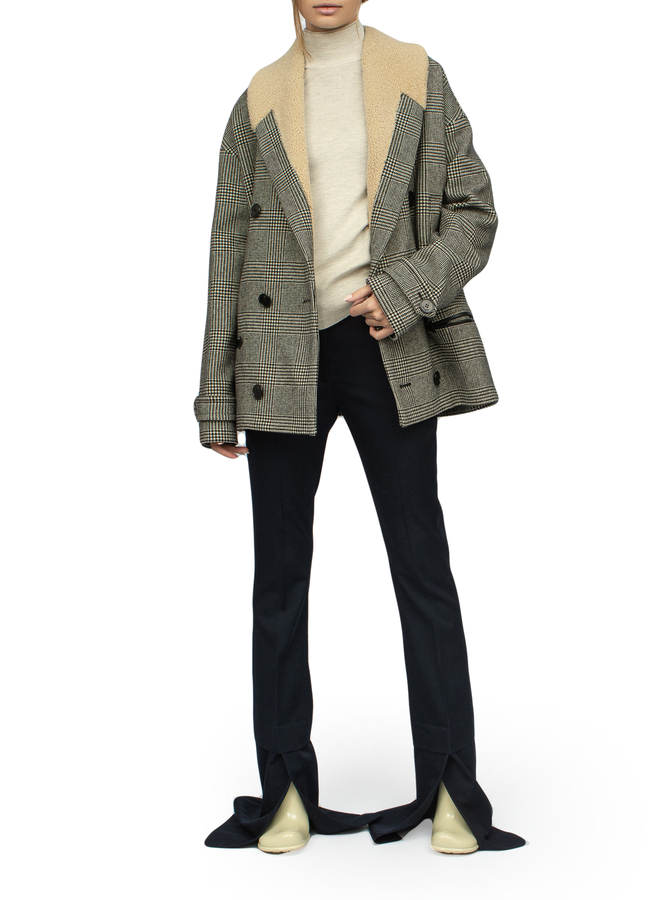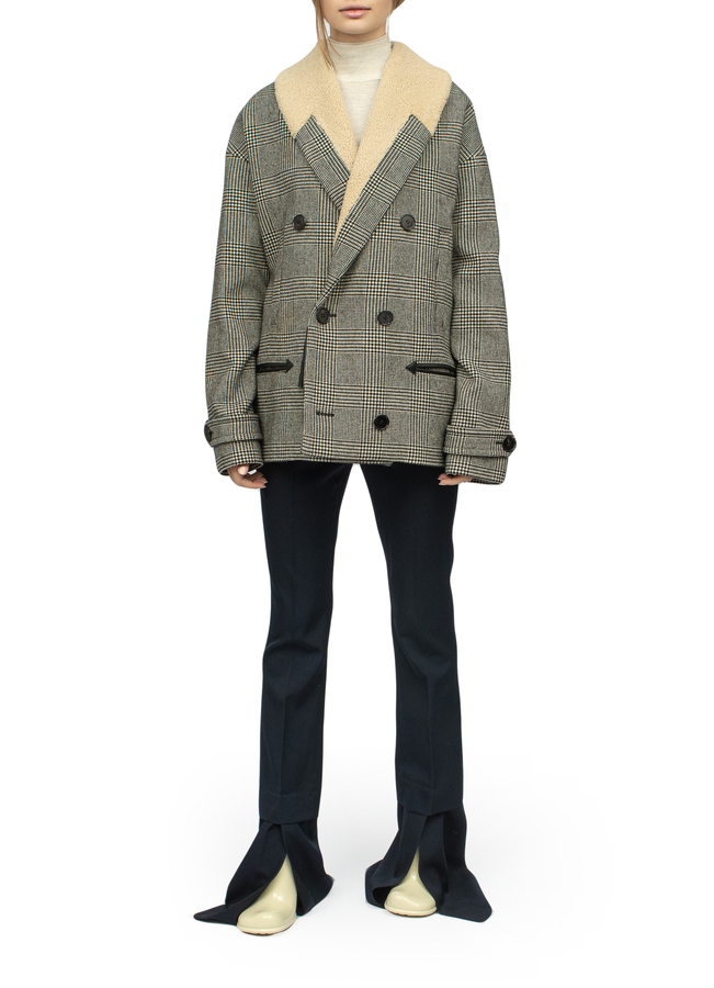 - Двухбортное пальто в клетку с отделкой мехом на воротнике. Длинные рукава, застежку на пуговицах спереди, боковой разрез, передние карманы на молнии, манжеты на пуговицах, подкладку из овчины и пуговицу на спине.