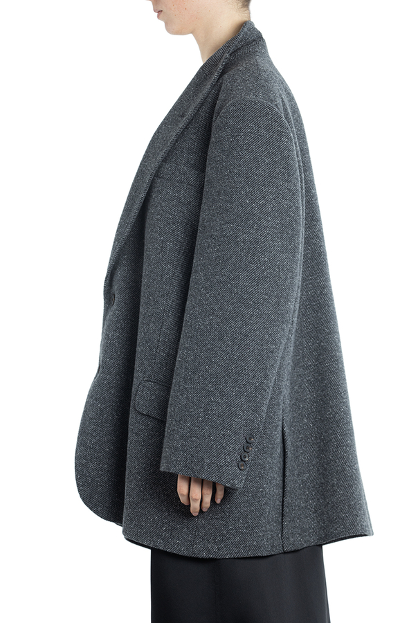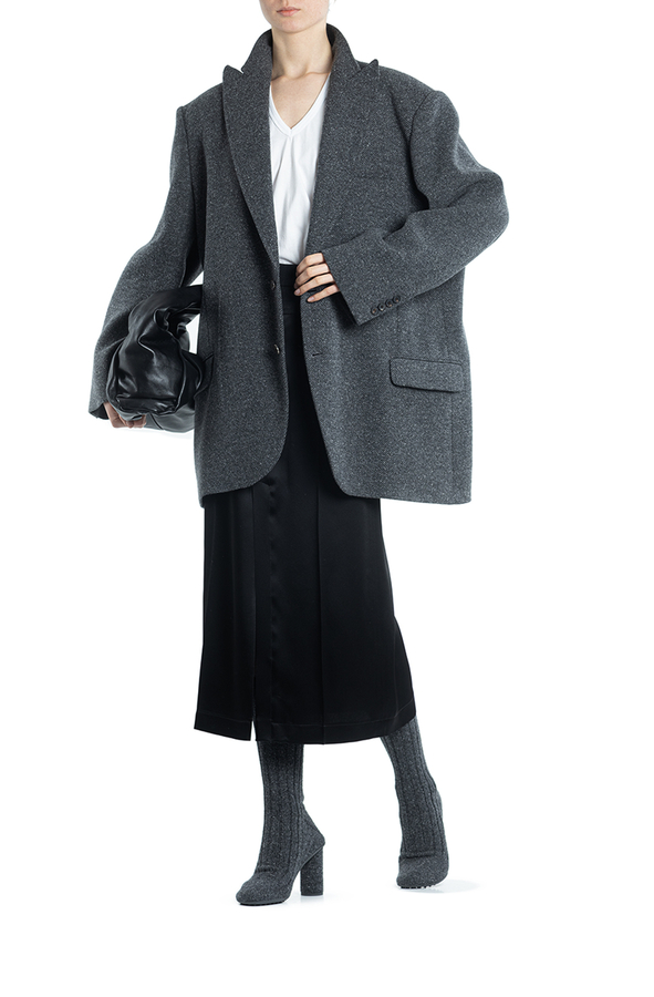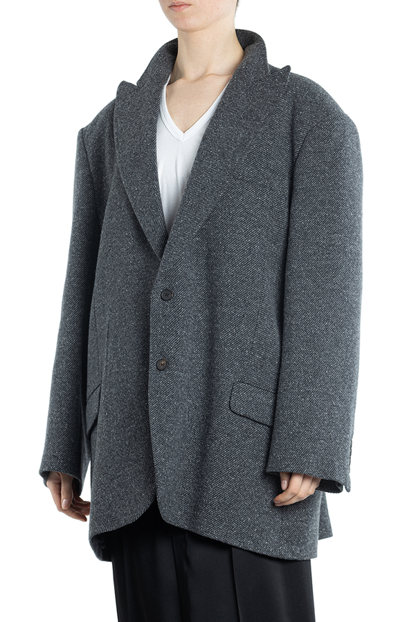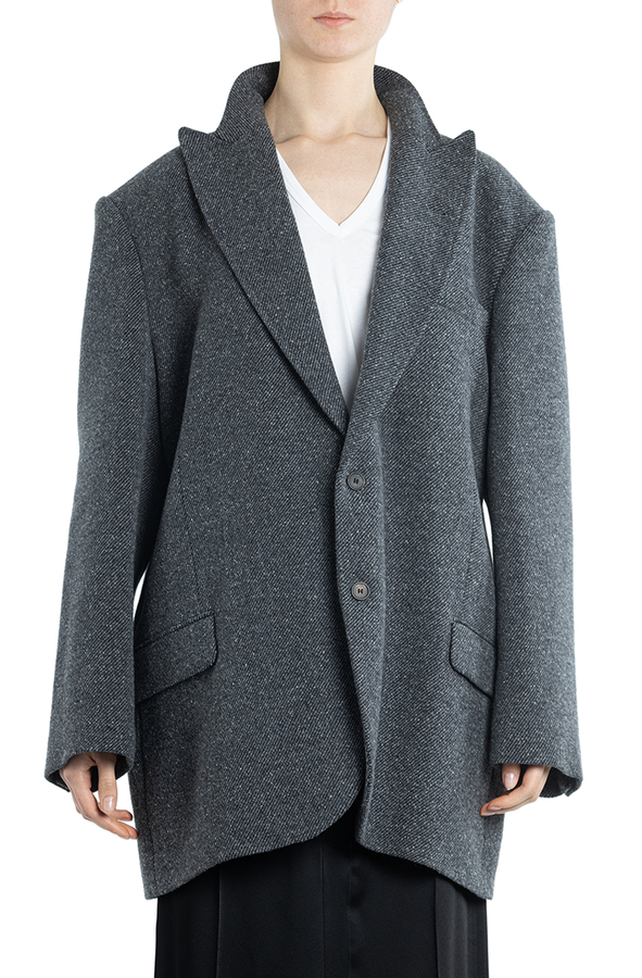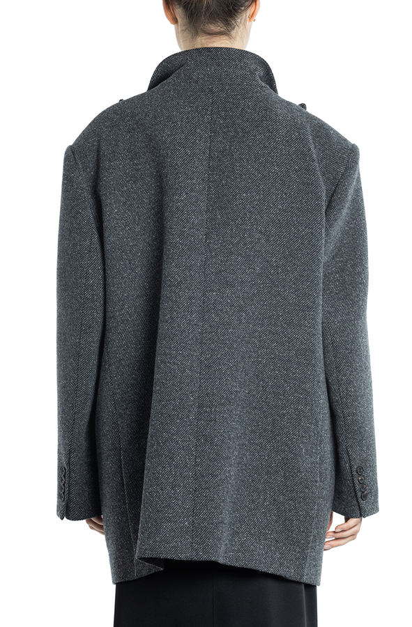 - Короткое пальто с острыми лацканами, застежка на пуговицы, один нагрудный прорезной карман и два с клапанами по бокам