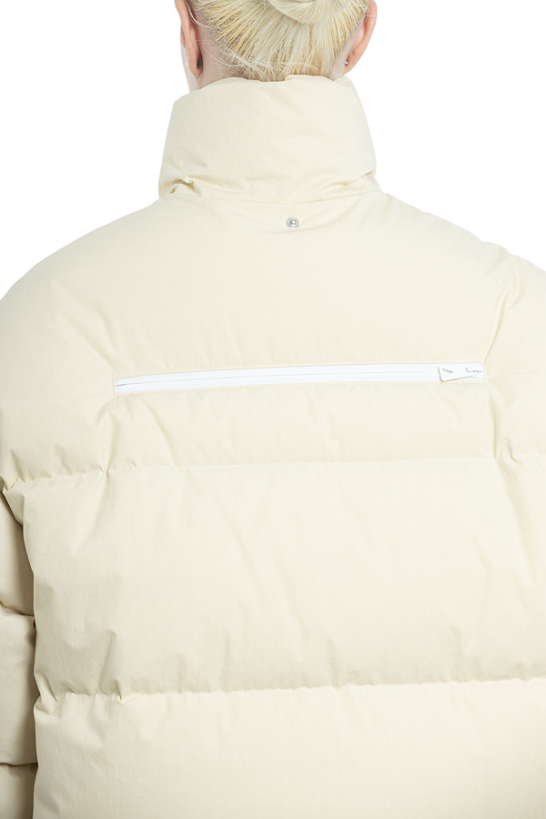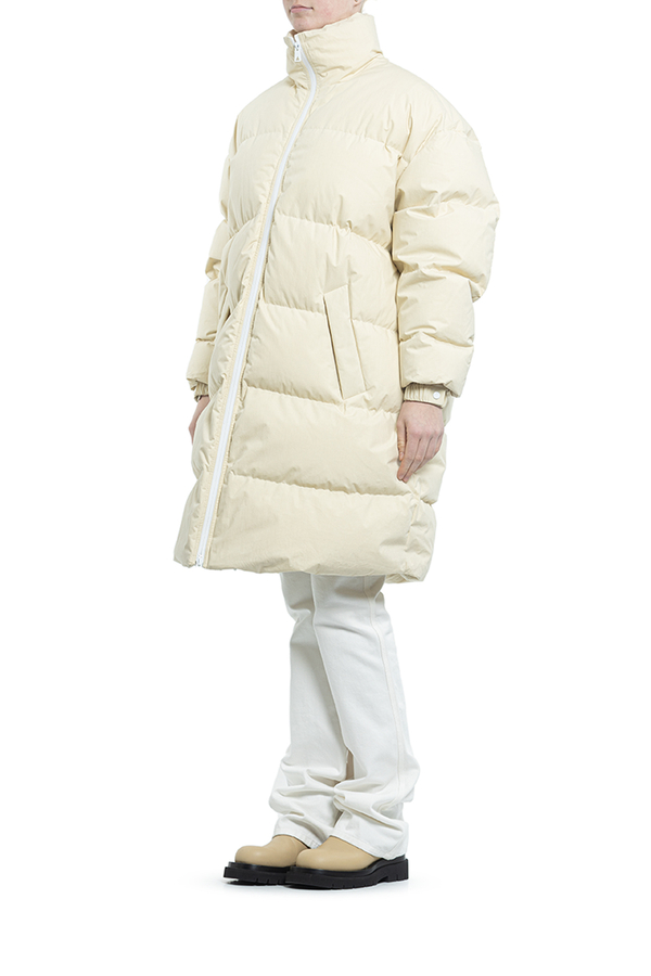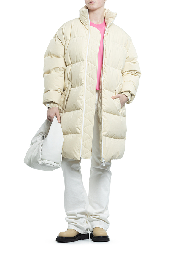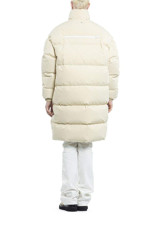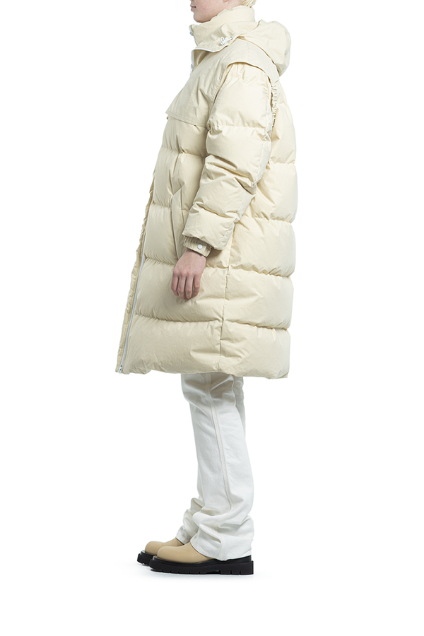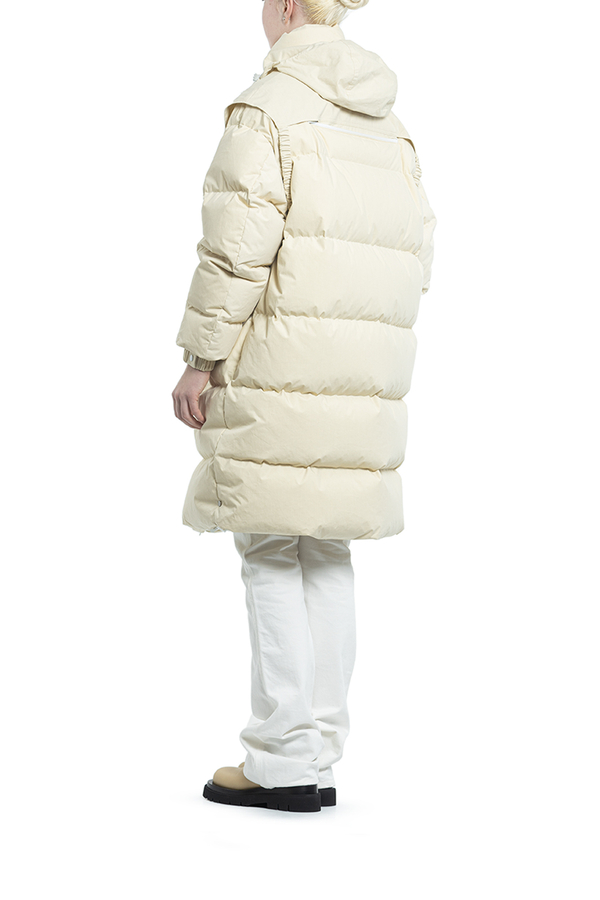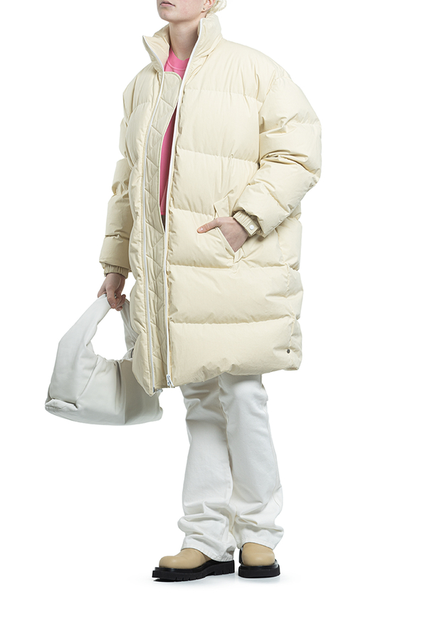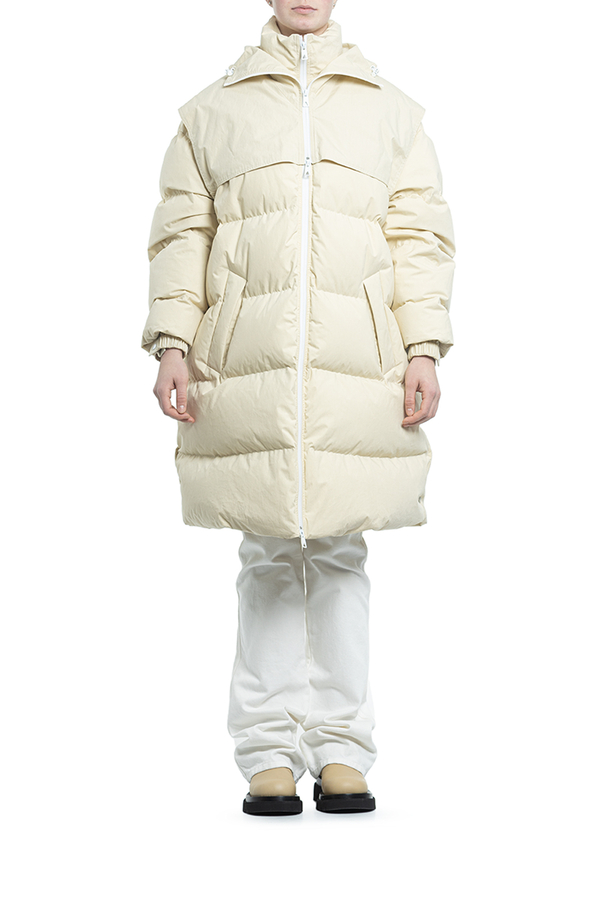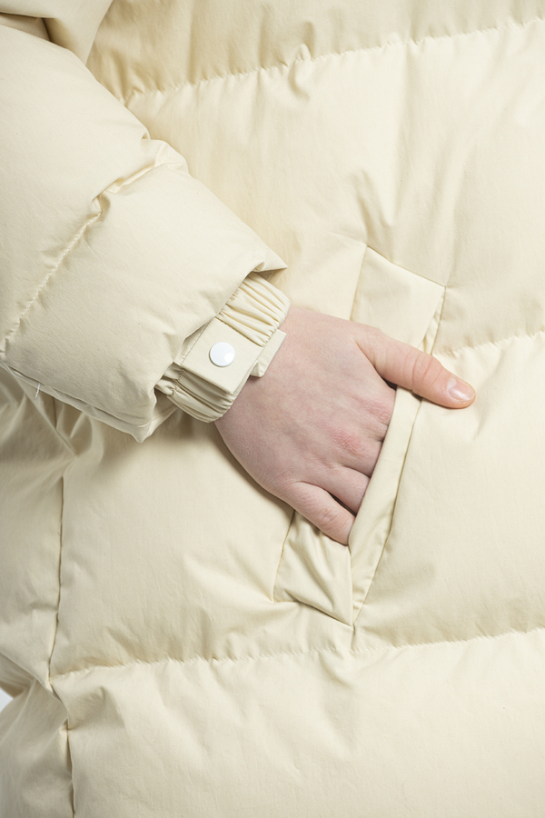 - Пуховик середньої довжини з капюшоном. Комір-стійка, класичний капюшон, застібка на блискавці спереду, довгі рукави, дутий матеріал і дві прорізні кишені з боків.