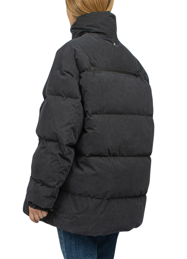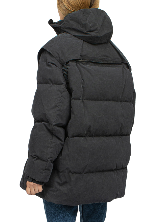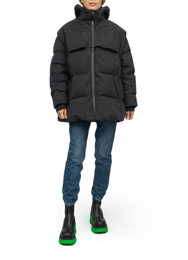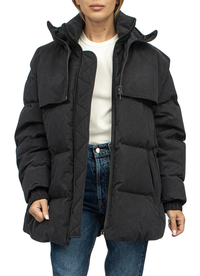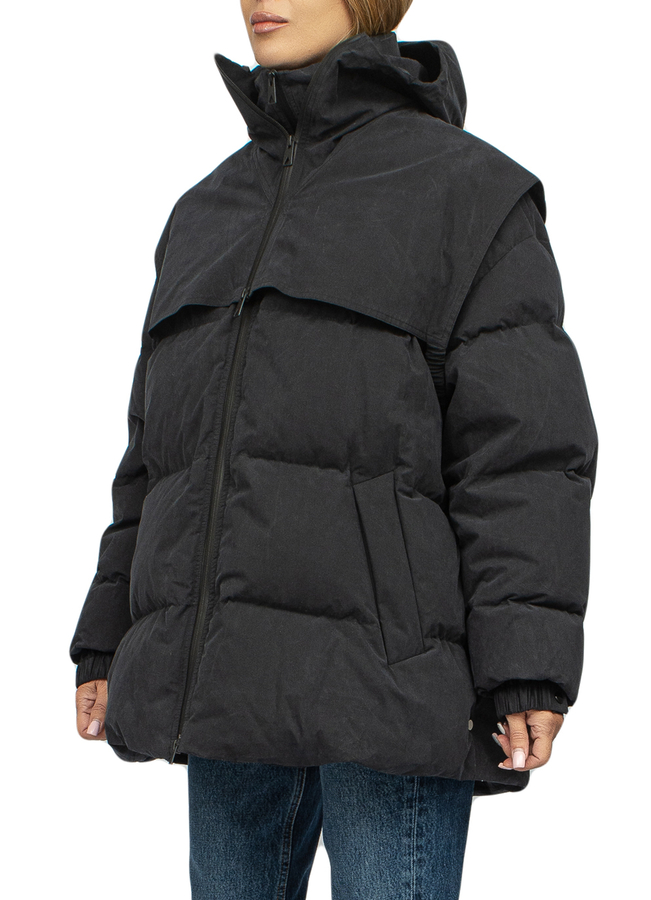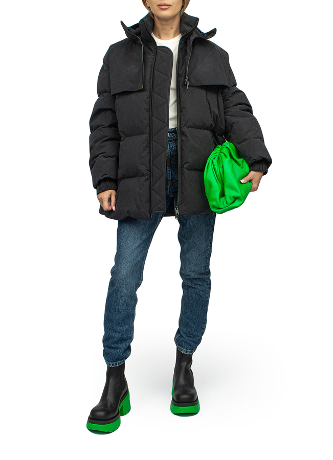 - Пуховик с капюшоном средней длины. Дутый дизайн, высокий воротник, длинные рукава, спереди застегивается на молнию, два боковых прорезных кармана.