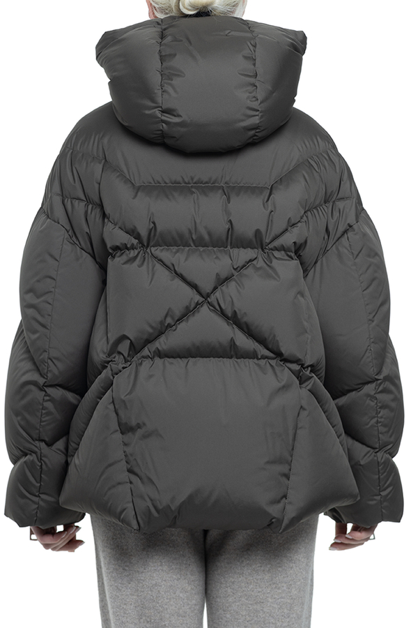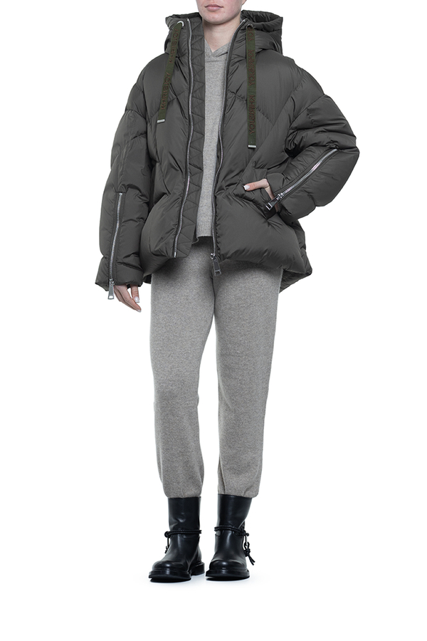 - Пуховик с регулируемым капюшоном, толстый воротник-стойка, V-образные швы спереди и сзади, геометрический мотив «X» на спине, спереди и на рукавах молнии, два прорезных кармана по бокам