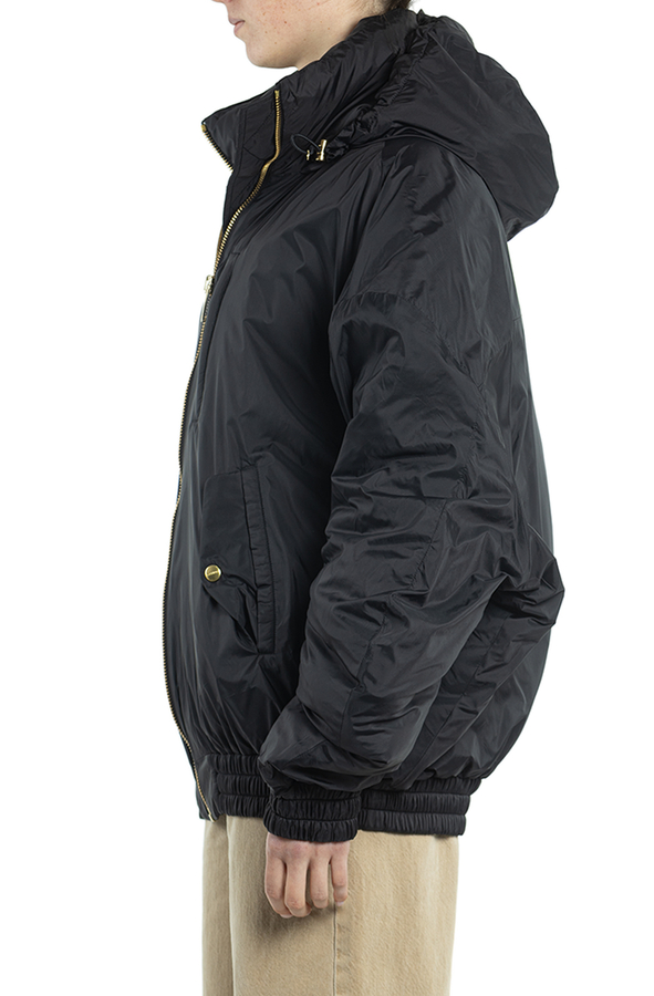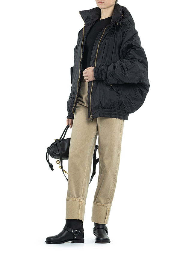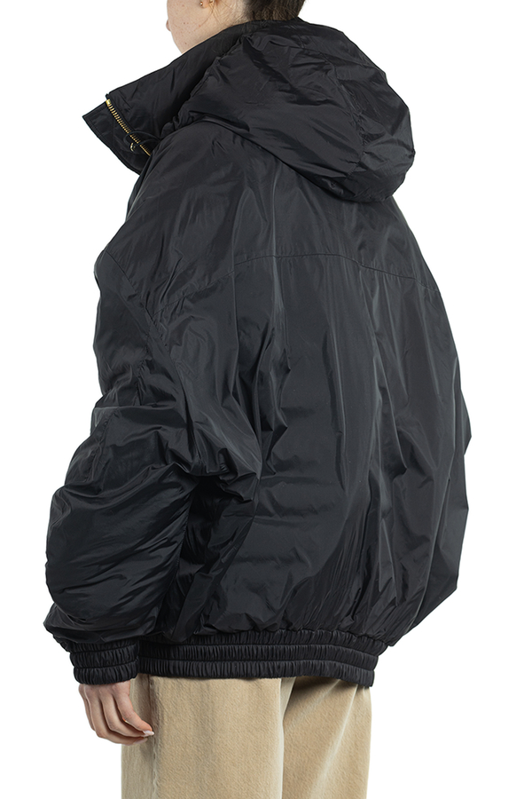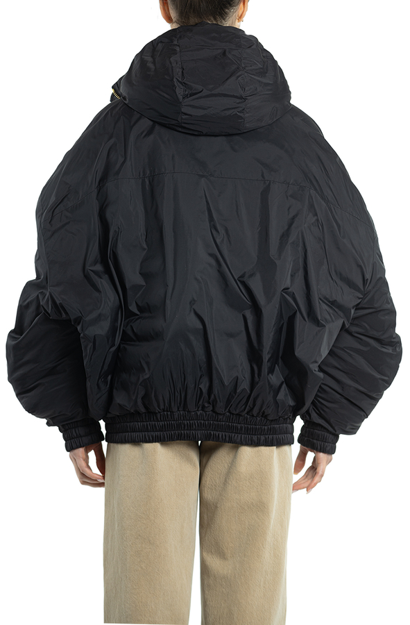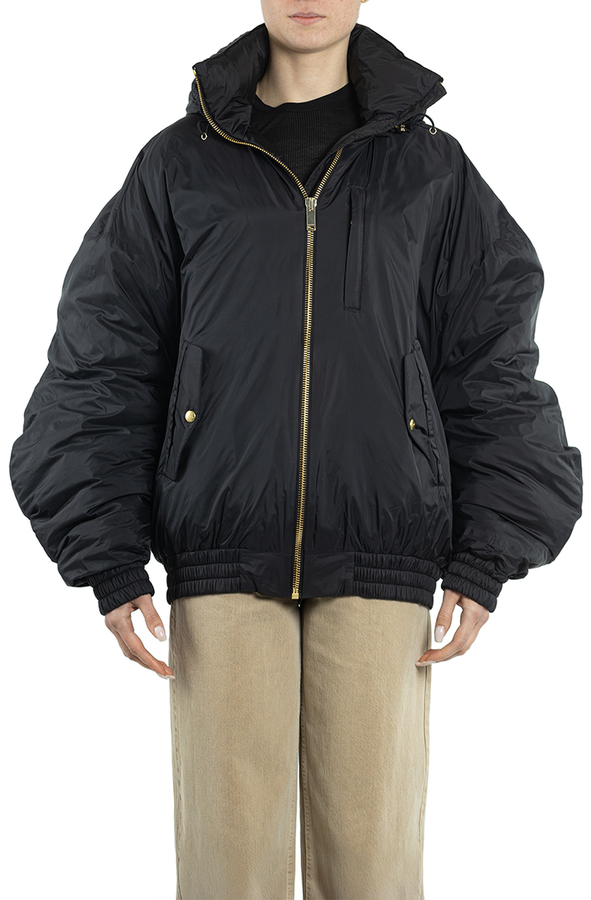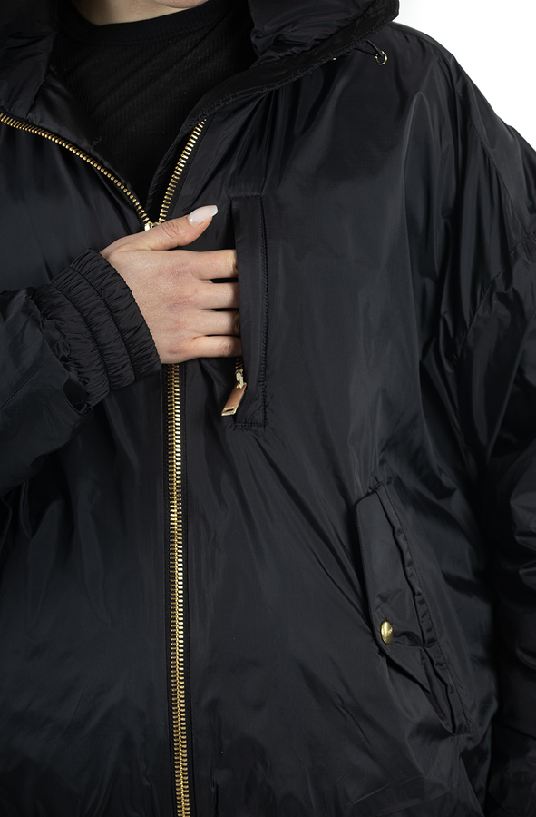 - Пуховик с капюшоном на кулисе, модель-owersize, спереди застежка-молния, два врезных кармана.