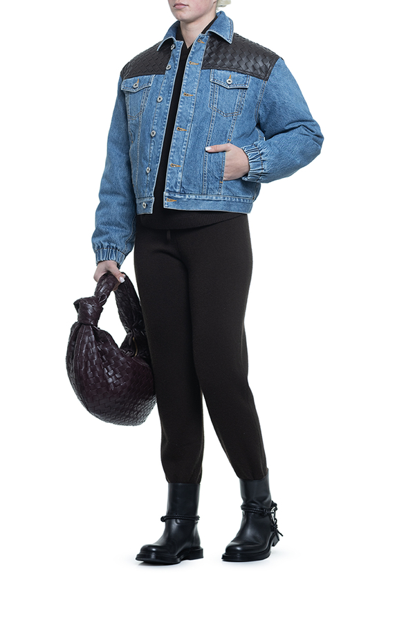 - Джинсовая куртка с классическим воротником, спереди застежка на пуговицы, эластичные манжеты и низ сзади, кожаные вставки с фирменным плетением на плечах, подкладка, два нагрудных кармана с клапанами и два прорезных кармана спереди