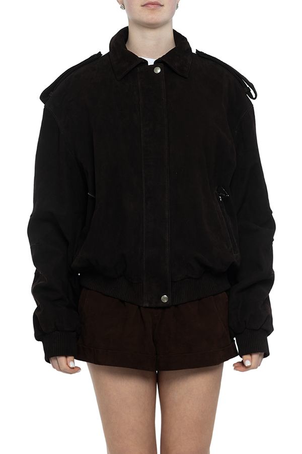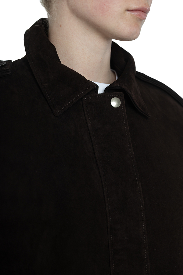 - Замшевая куртка с длинными рукавами, погоны на плечах, воротник с острыми лацканами, ребристые манжеты и низ, застежка-скрытая молния и кнопки, два прорезных кармана на молнии спереди