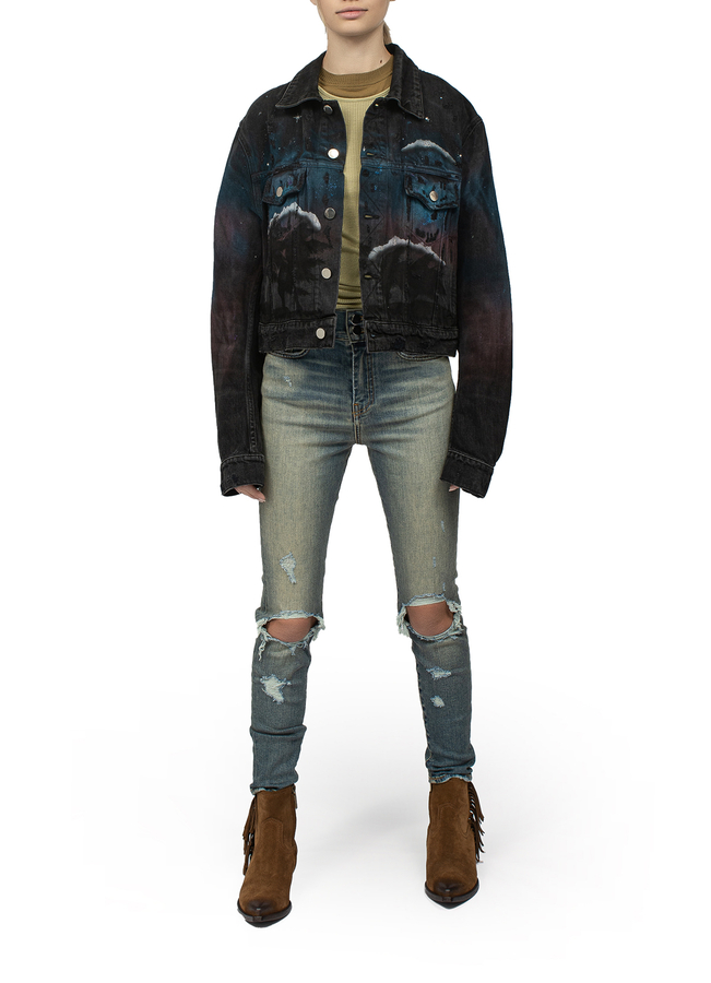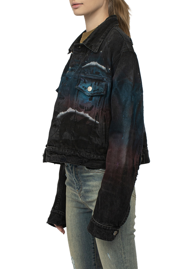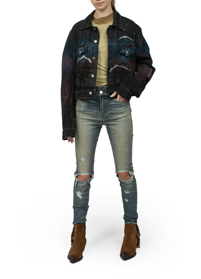 - Джинсовая куртка с умышленными повреждениями. Длинные рукава, классический воротник, застежка на пуговицы спереди. Два накладных кармана на груди и два по бокам на кнопках. Разноцветный принт.
