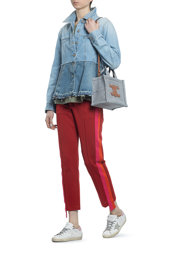 - Джинсова куртка розкльошеного крою з принтом квітів на спині.