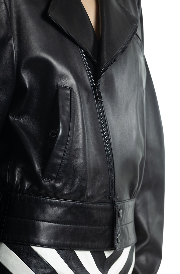 - Кортка шкіряна куртка. Широкий пояс, великі лацкани та погони.