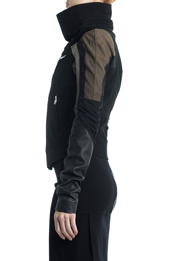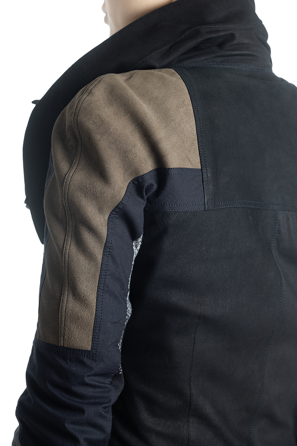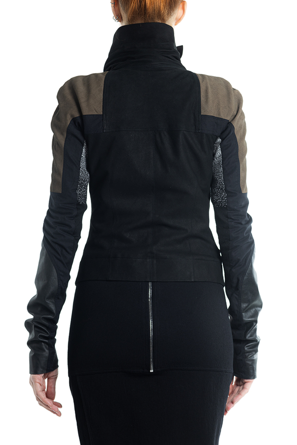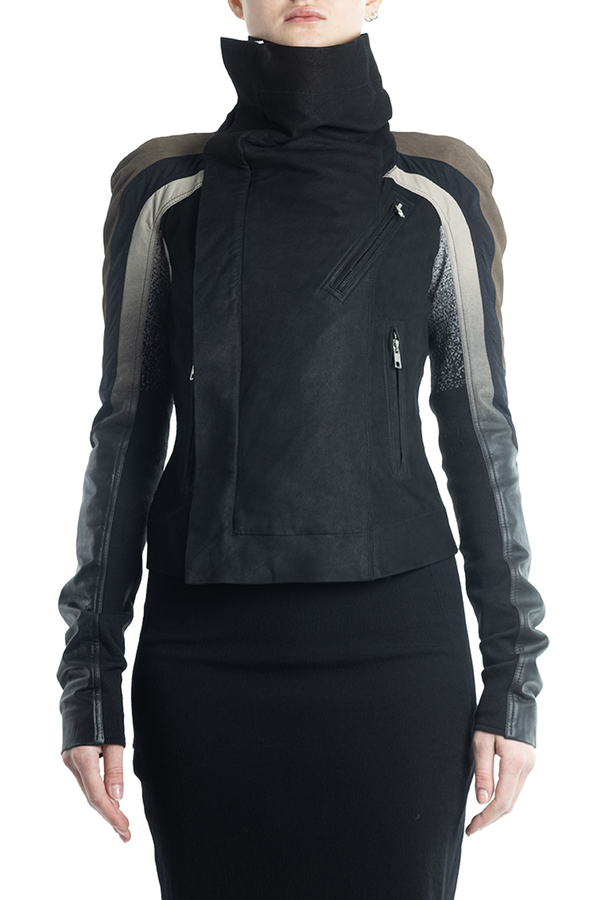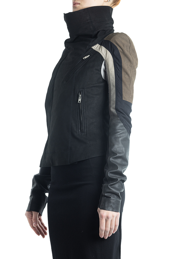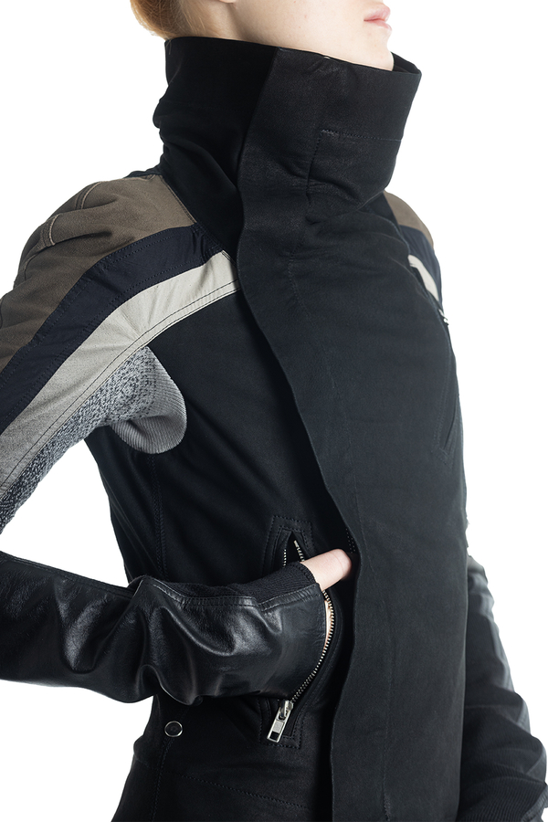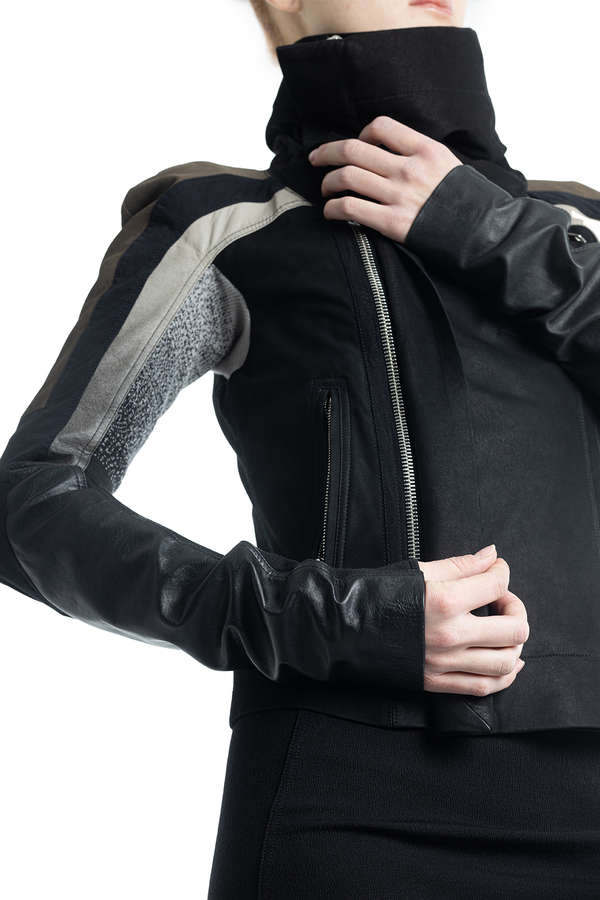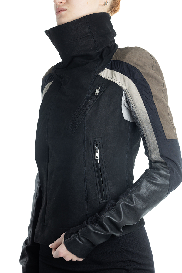 - Шкіряна куртка з контрастними вставками на рукавах, високий воріт, асиметрична застібка на блискавку спереду, одна нагрудна та дві бокові прорізні кишені