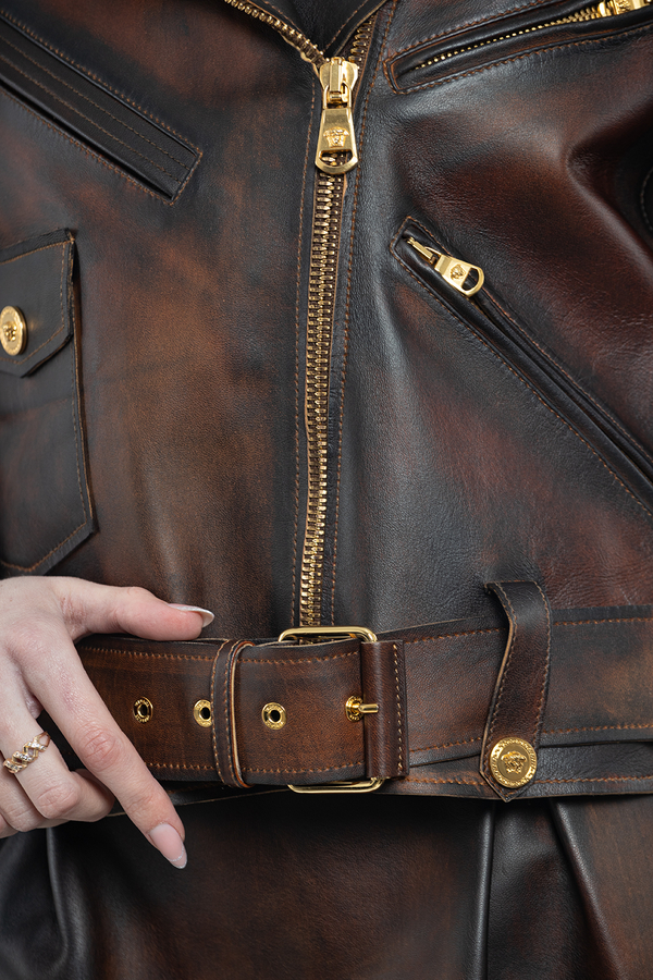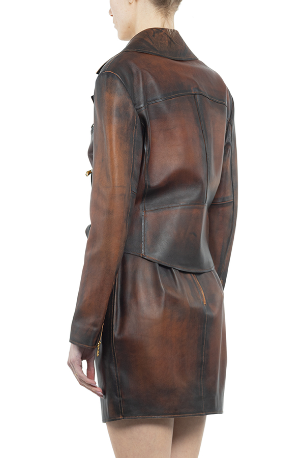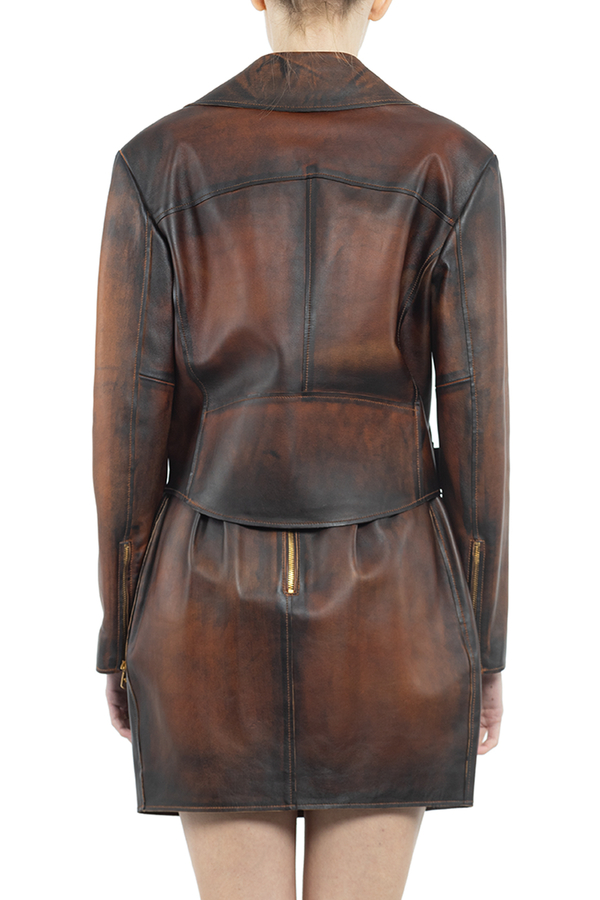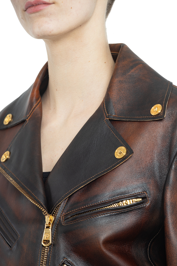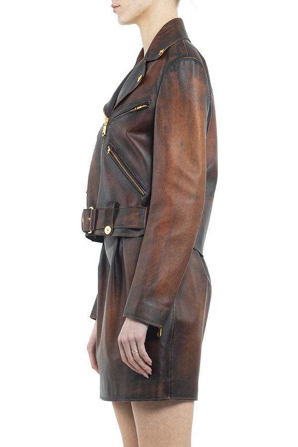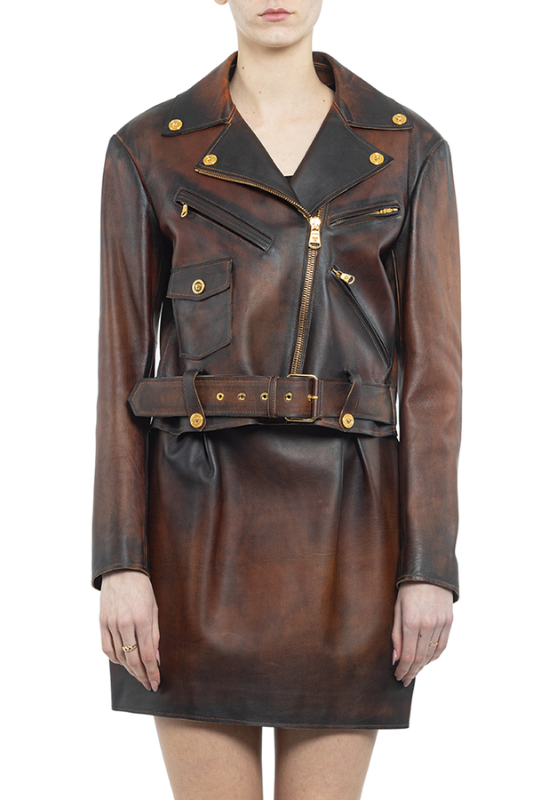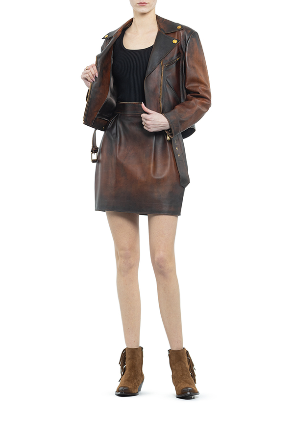 - Коротка шкіряна куртка с довгими рукавами і зміщеною блискавкою спереду. Фурнітура золотистого кольору.