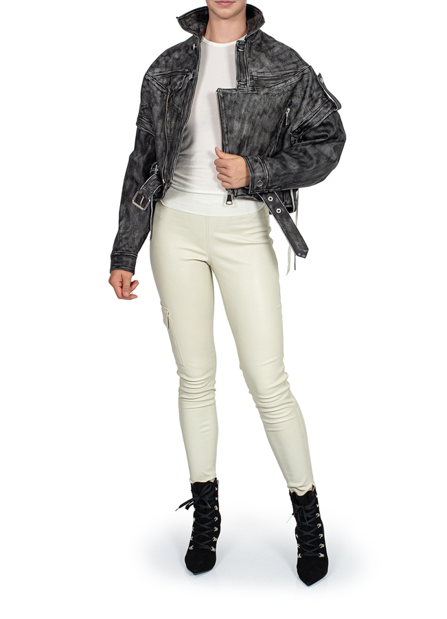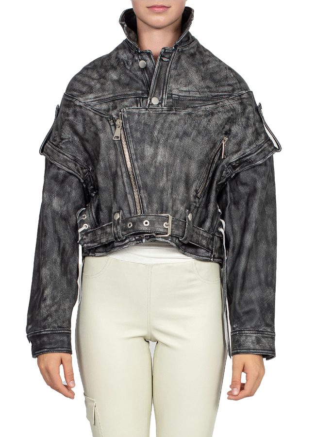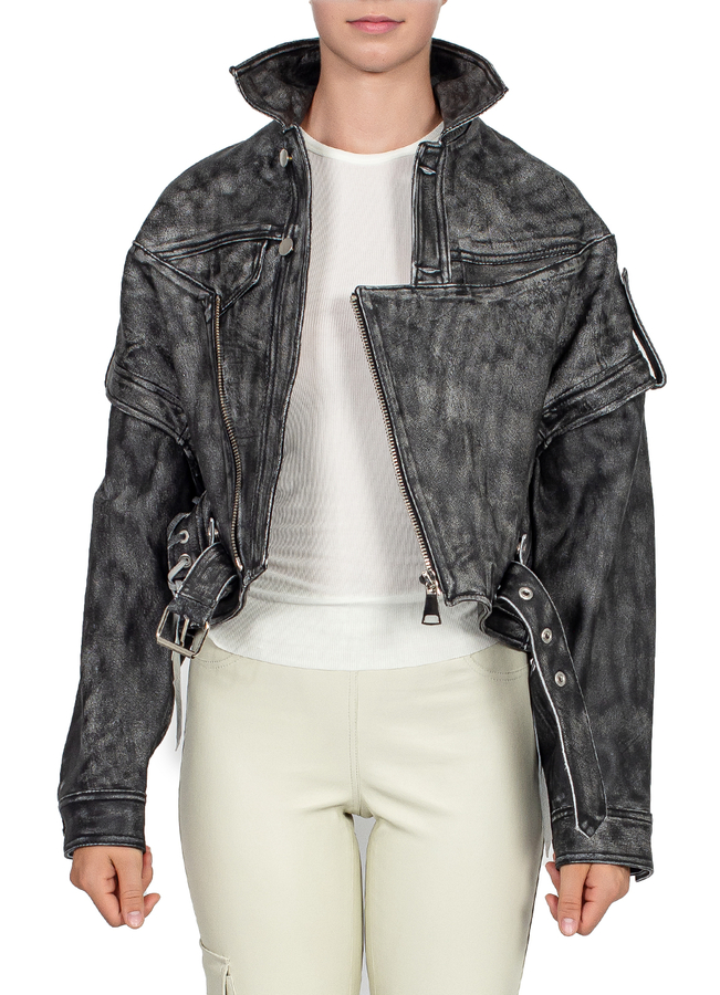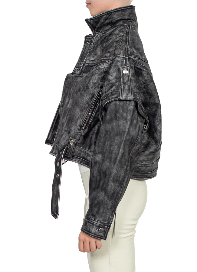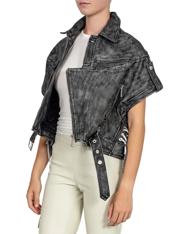 - Вінтажна шкіряна куртка, вільний крій, знімні рукава, повна підкладка, спереду на поясі ремінь, застібка на гудзики та блискавку
