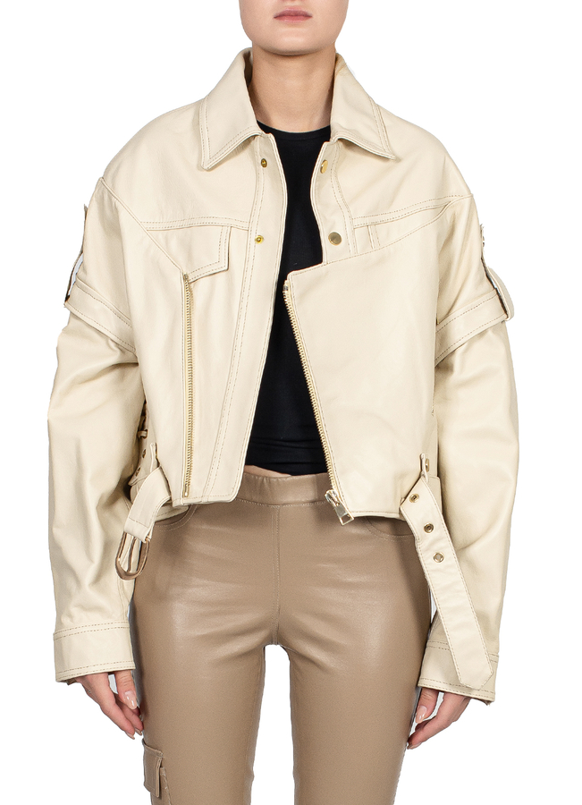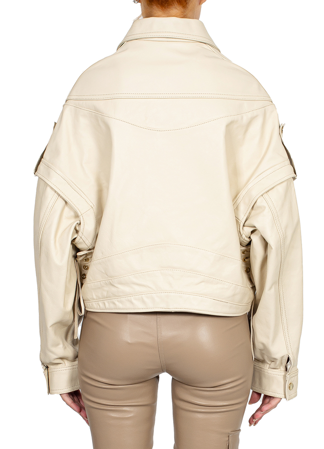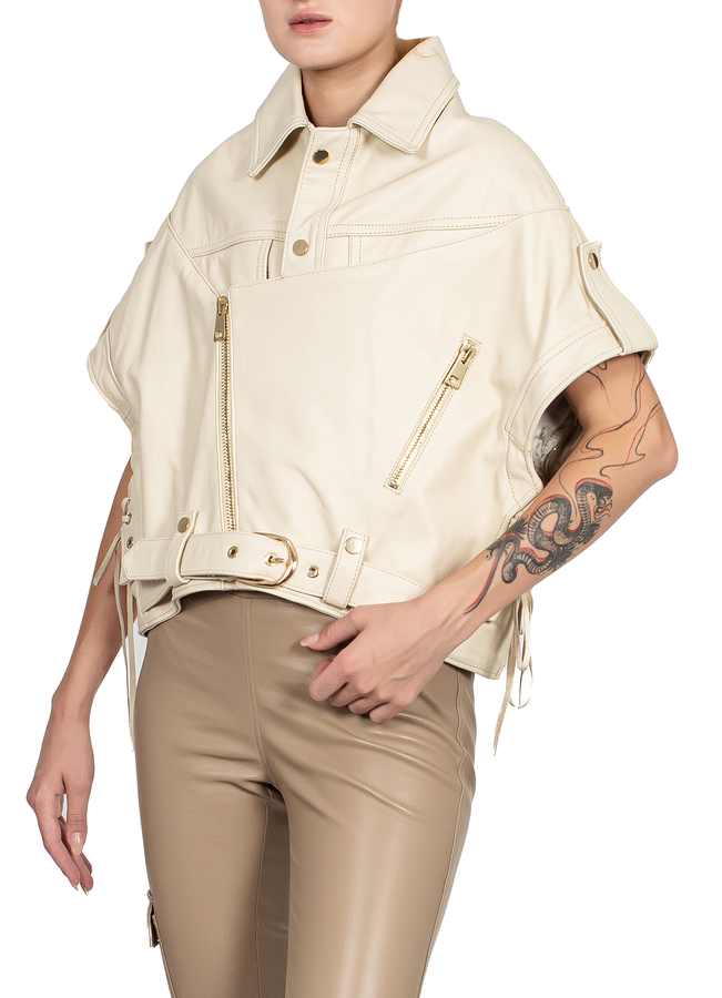 - Вінтажна шкіряна куртка, вільний крій, знімні рукава, повна підкладка, спереду на поясі ремінь, застібка на гудзики та блискавку