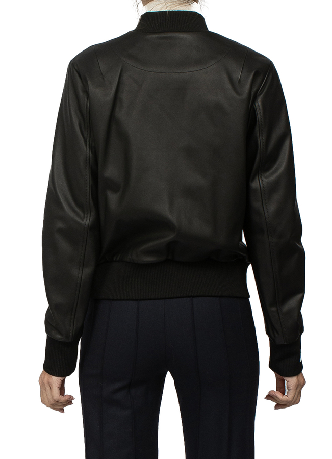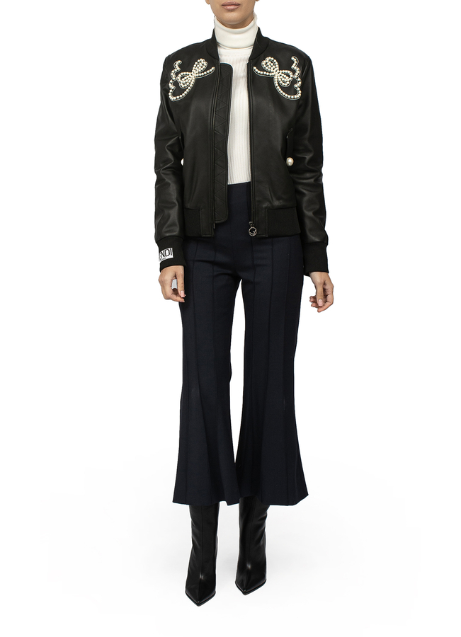 - Кожаная куртка с длинными рукавами и двумя врезными карманами с клапанами. Декорирована большими жемчужинами.