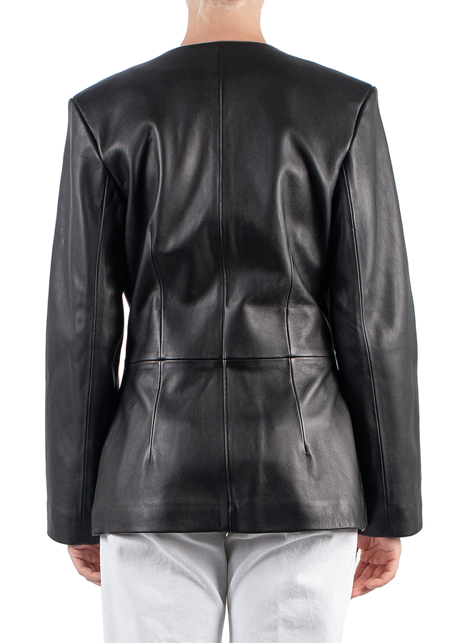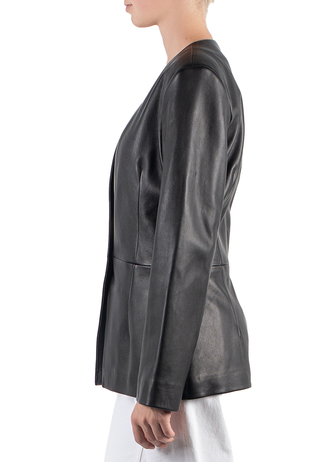 - Шкіряний жакет з довгими рукавами, застібка на один гудзик.