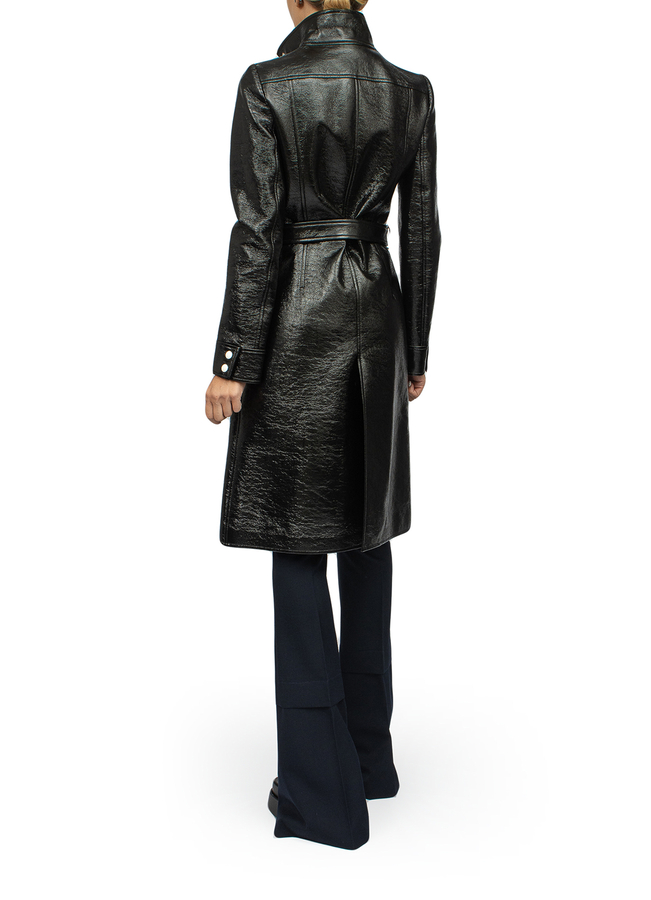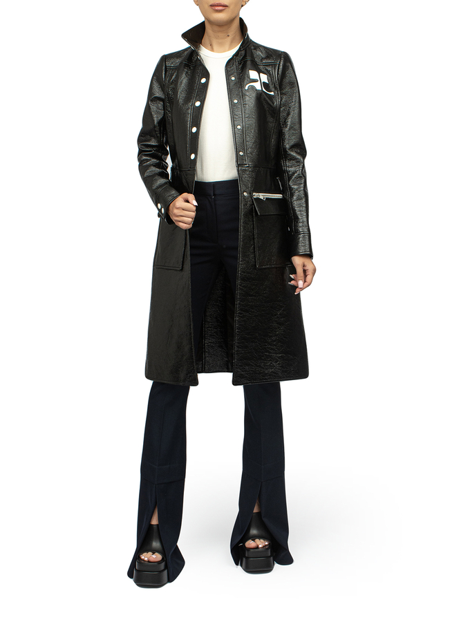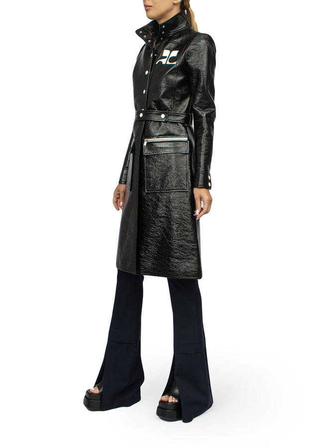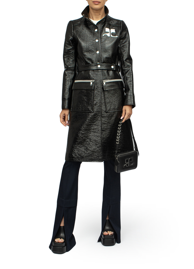 - Лакированный плащ с накладными карманами. Воротник-стойка, застежка на кнопках спереди, длинные рукава, ремень на талии, передние карманы на молнии и с клапанами, длина меди и нашивка с логотипом спереди.