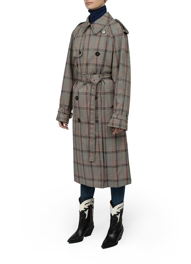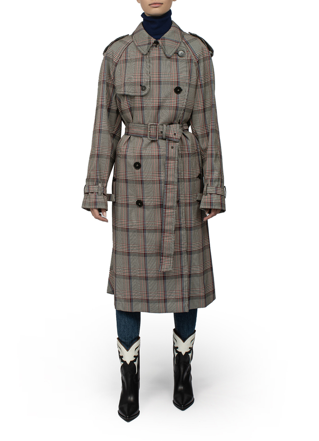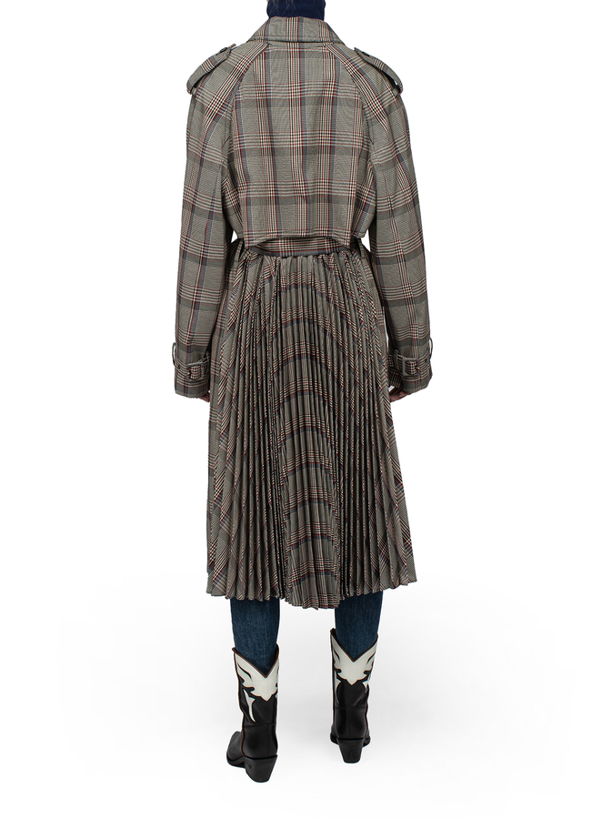 - Двухбортный тренч в клетку. Эполеты на плечах, длинные рукава, манжеты с ремешками, ремень на талии и прорезные карманы по бокам. Низ изделия из плиссированной ткани сзади.