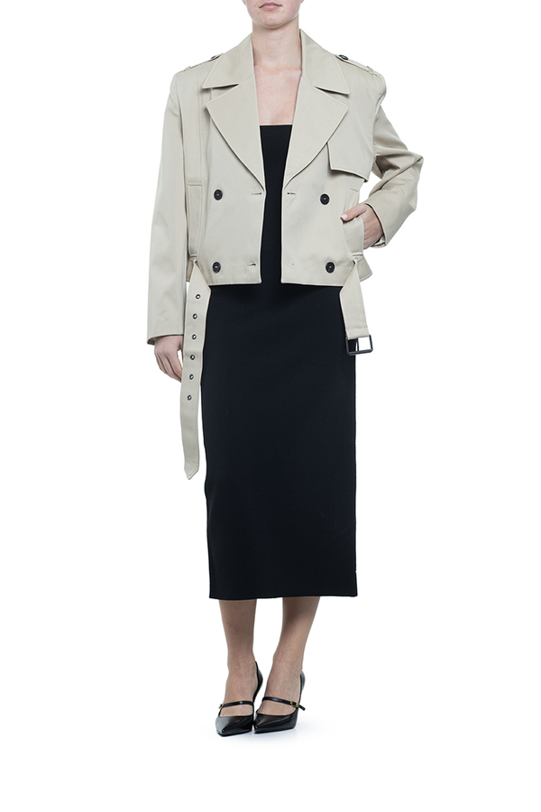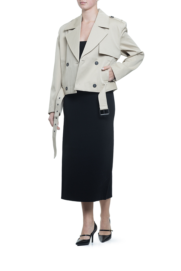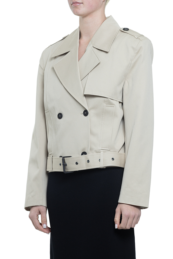 - Укороченный тренч, классический воротник с лацканами, спереди пуговицы, поясной ремень, два прорезных кармана по бокам