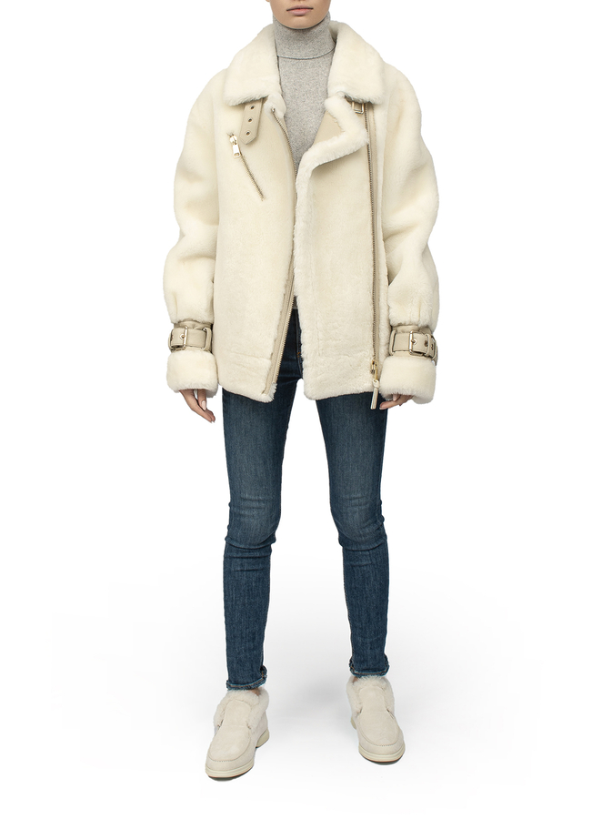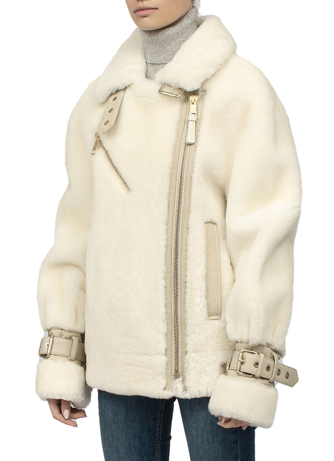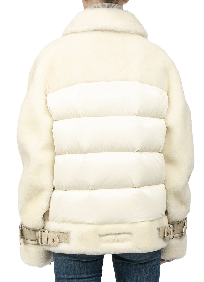 - Короткая куртка-дублёнка со стеганной пуховой спинкой. Асимметричная передняя застежка-молния. Прорезные карманы на бедрах. Манжеты ремня с пряжкой. Серебристая фурнитура. Нашивка с тиснением логотипа над подолом.