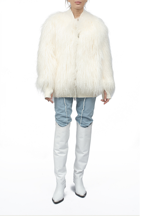 - Короткая дубленка из овчины с белым мехом изнутри.