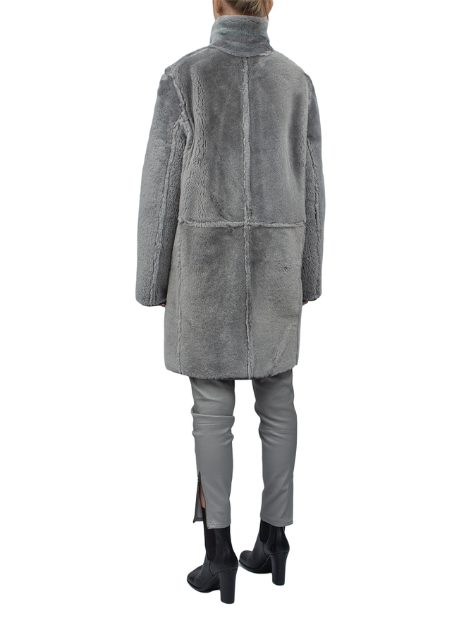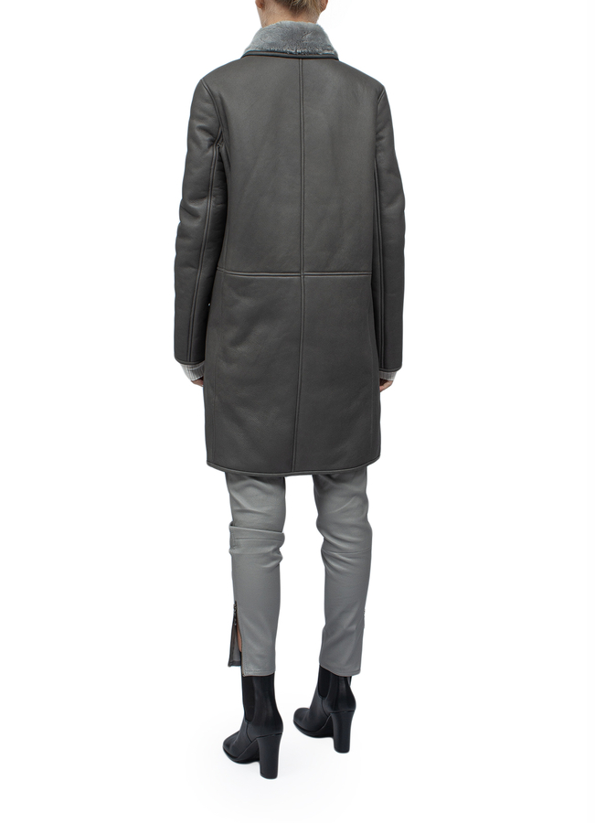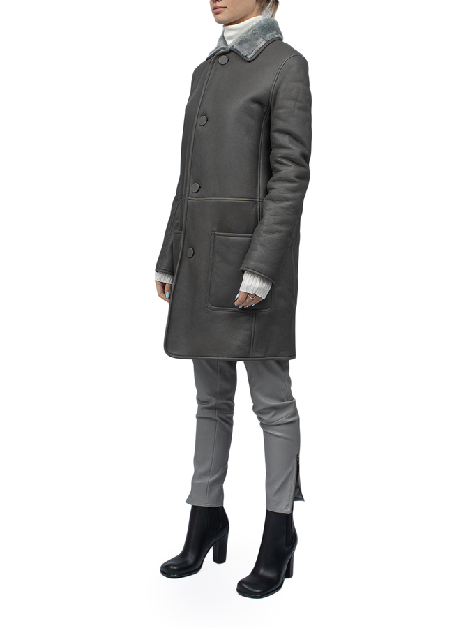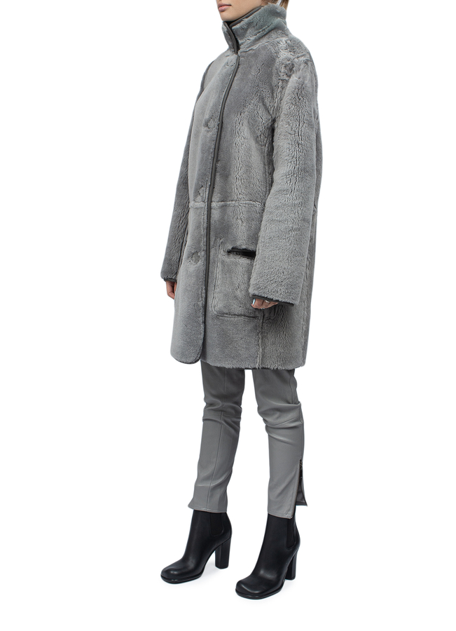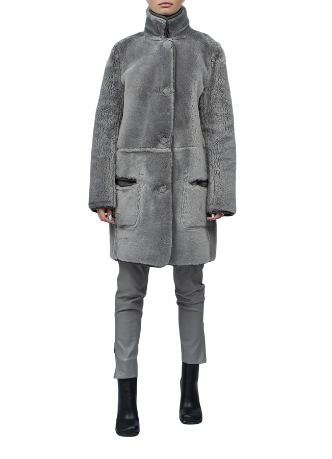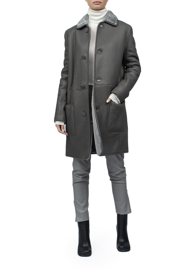 - Дубленка средней длины с отложным воротником. Длинные рукава, два накладных кармана, два прорезных кармана, застежка на пуговицы.