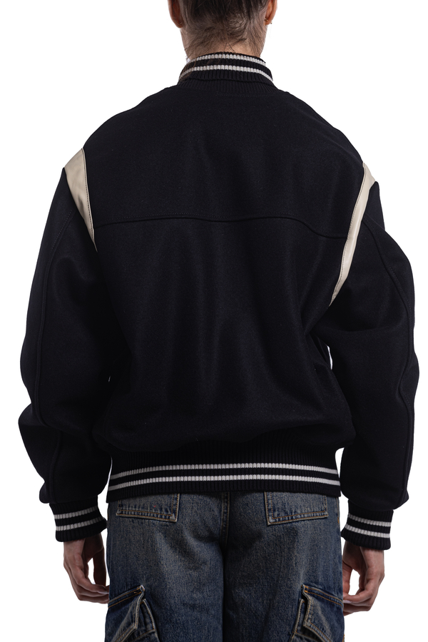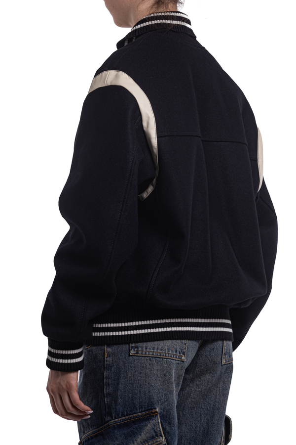- Бомбер на кнопках, манжеты, низ и воротник в рубчик, два прорезных кармана по бокам, вышитый логотип бренда на груди