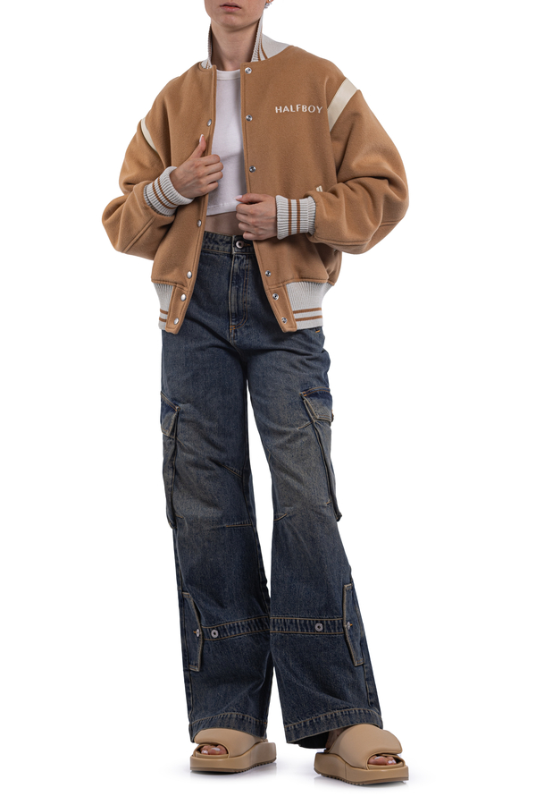 - Бомбер на кнопках, манжеты, низ и воротник в рубчик, два прорезных кармана по бокам, вышитый логотип бренда на груди