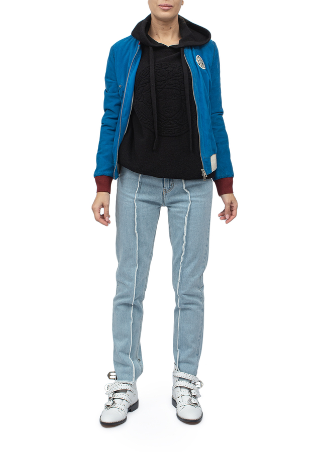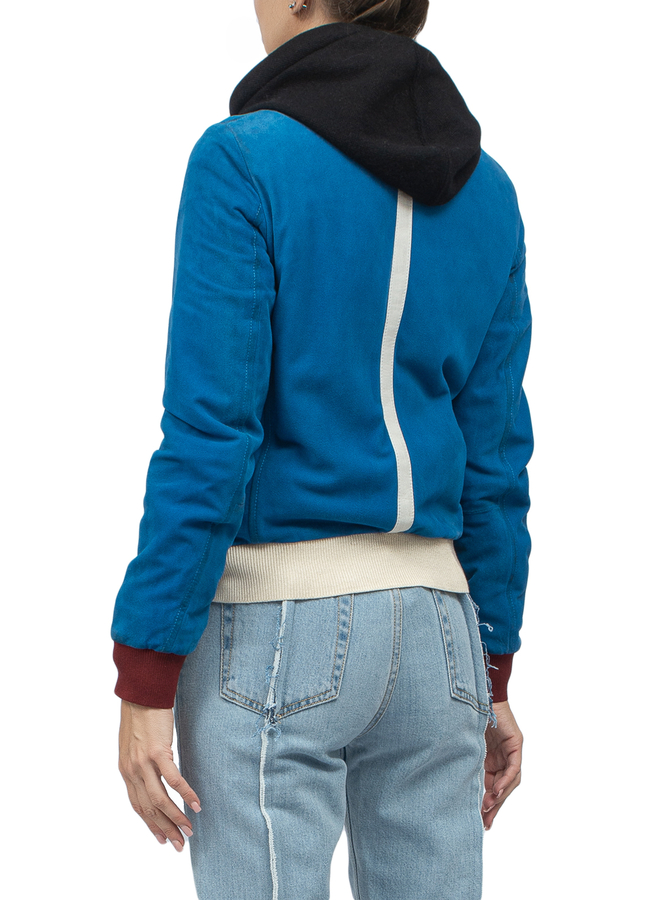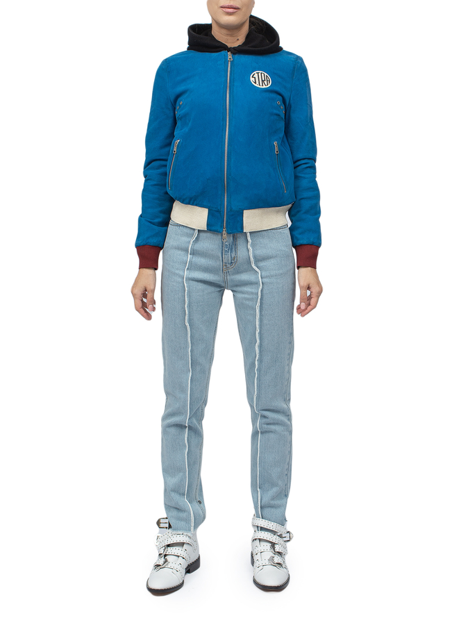 - Замшевая куртка-бомбер. Застежка на молнию, два боковых кармана.