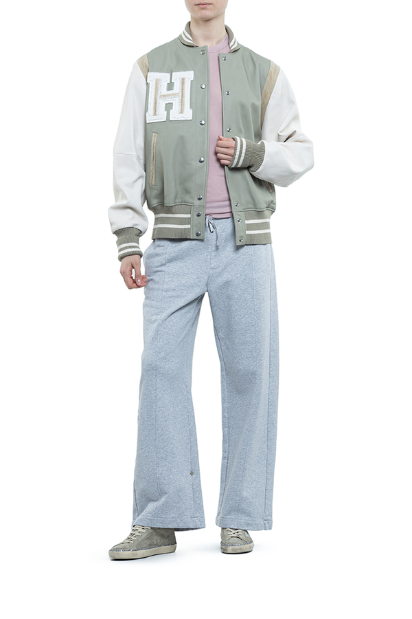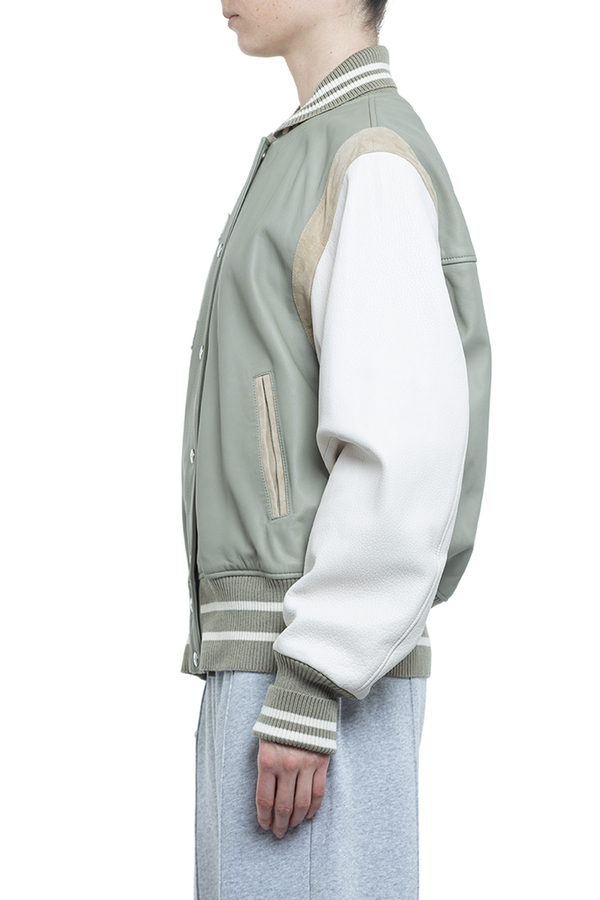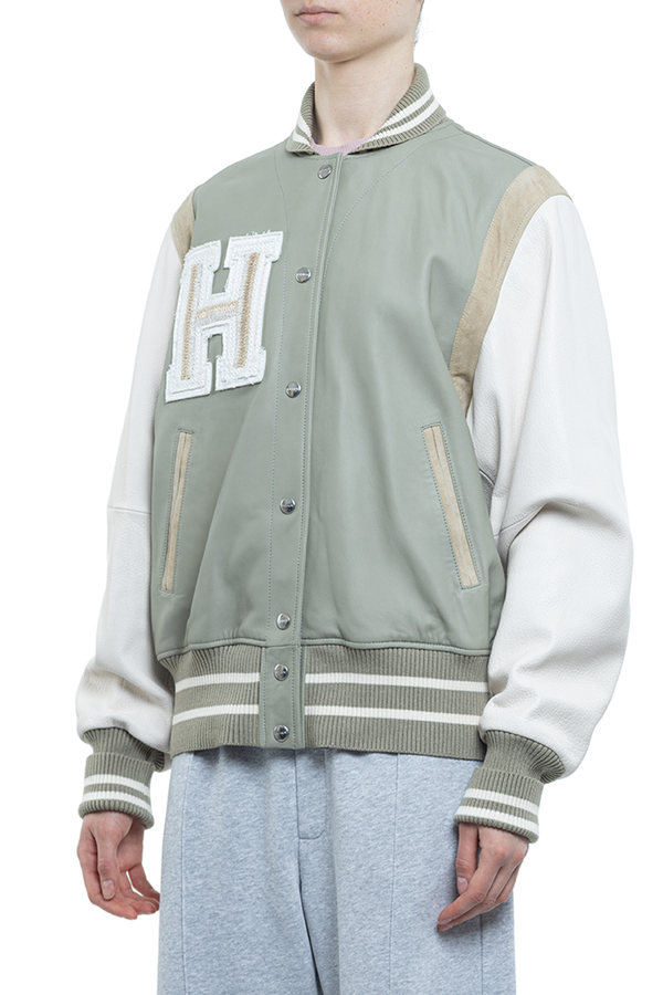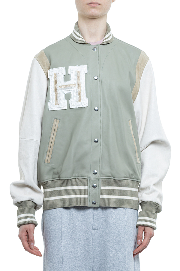 - Кожаный бомбер с эластичными манжетами, низом и воротами, спереди застежка на кнопки, два скошенных прорезных кармана, нашивка в виде логотипа на груди