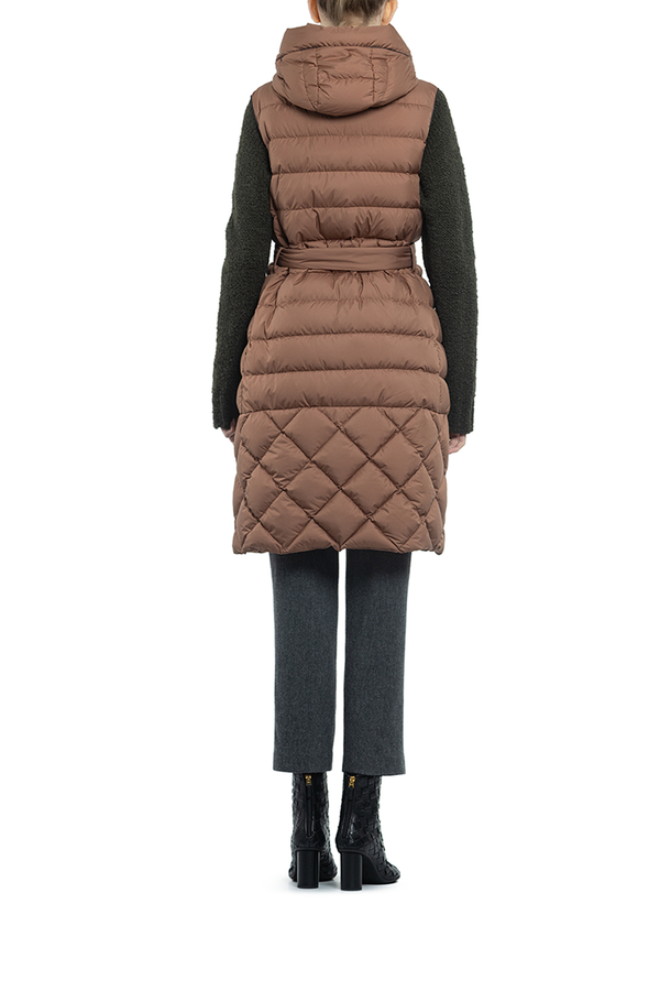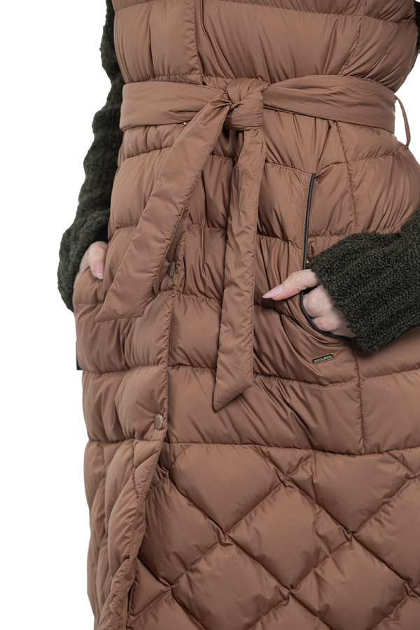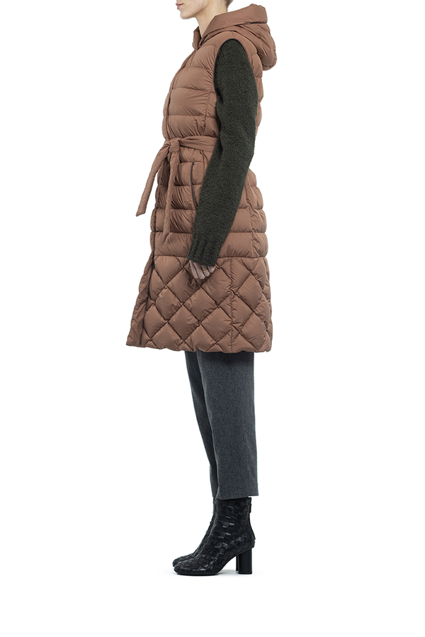 - Довгий жилет з капюшоном. Застібка на кнопках, з паском на талії. Дві бічні врізні кишені, без рукавів.