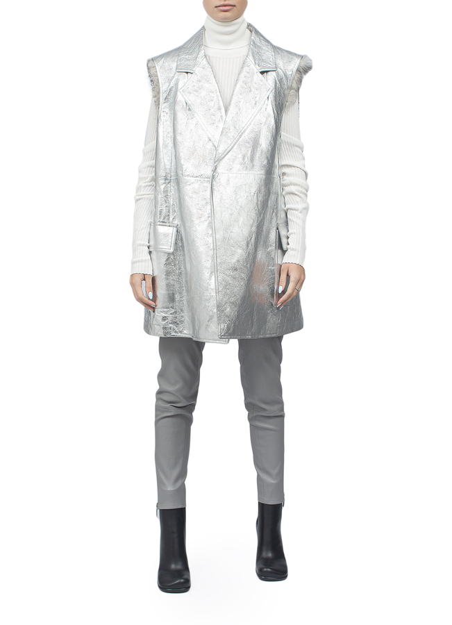 - Кожаный жилет с отстегивающейся меховой подкладкой. Имеет лацкан с выемкой, два боковых кармана с клапанами.