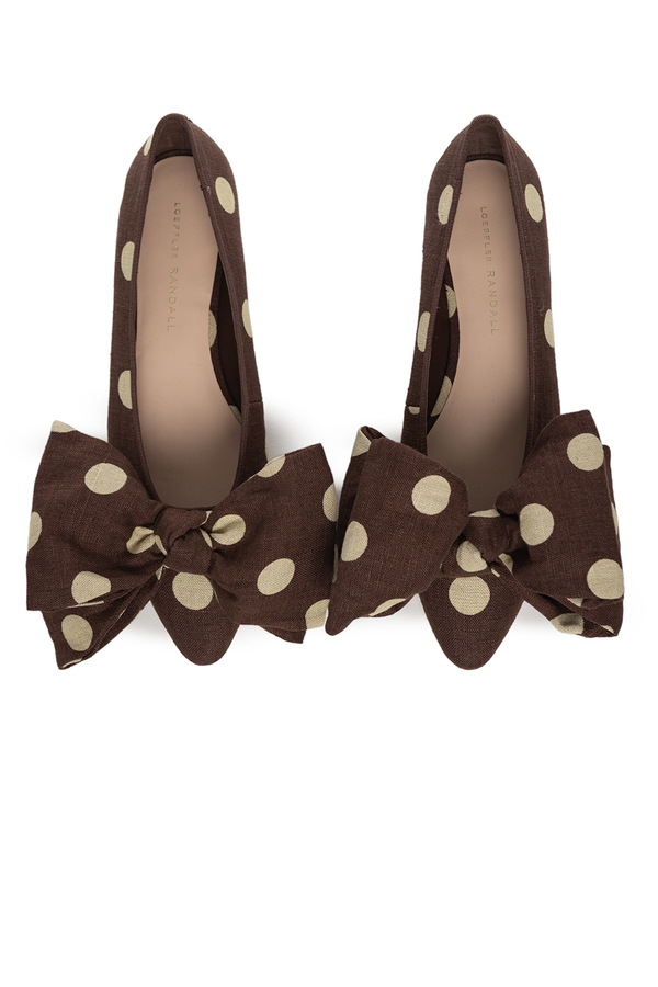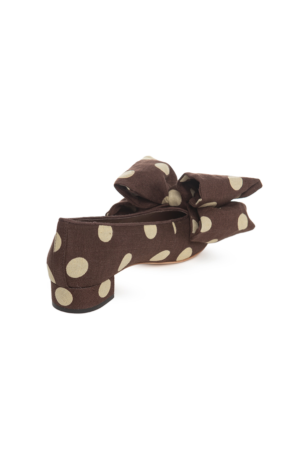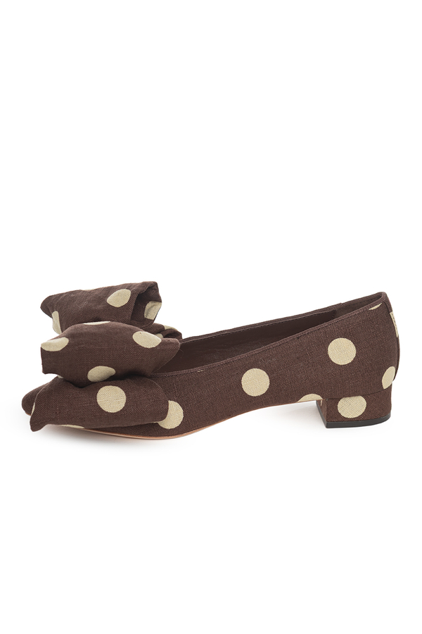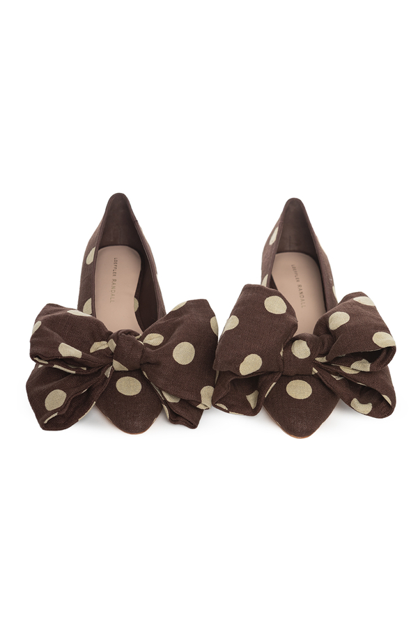 - Балетки в горошок з гострим носком, прикрашені фірмовим бантом, м'яка шкіряна устілка із золотим тисненим логотипом