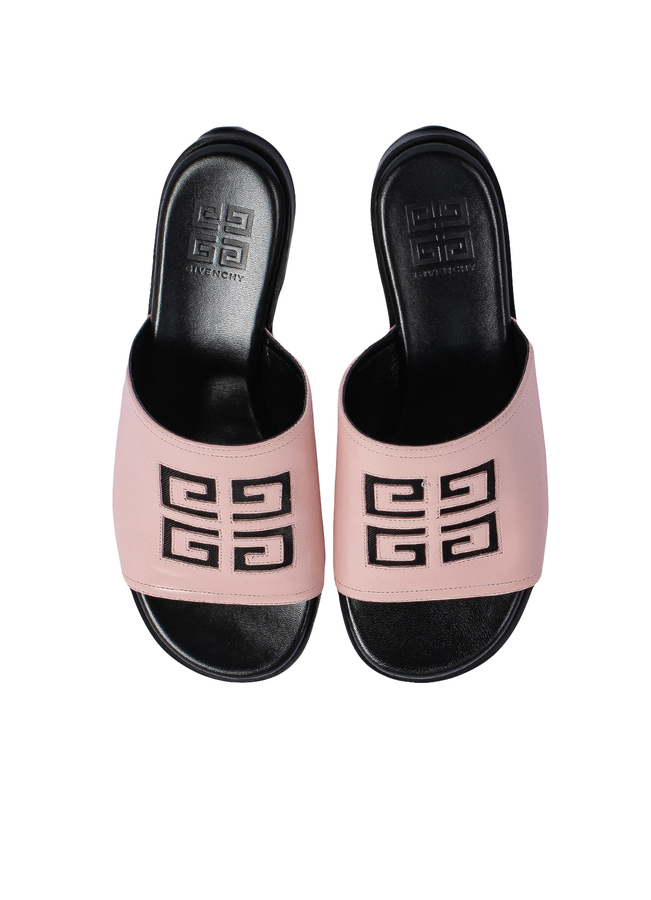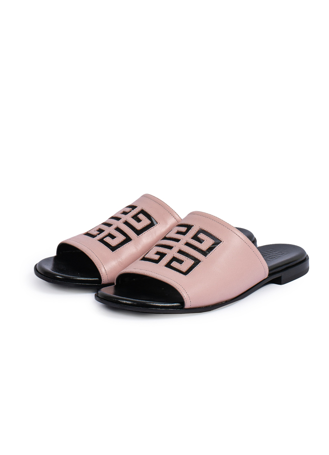 - Шкіряні шльопанці з тисненим логотипом. Відкритий носок, устілка з логотипом, плоска підошва та без застібки.