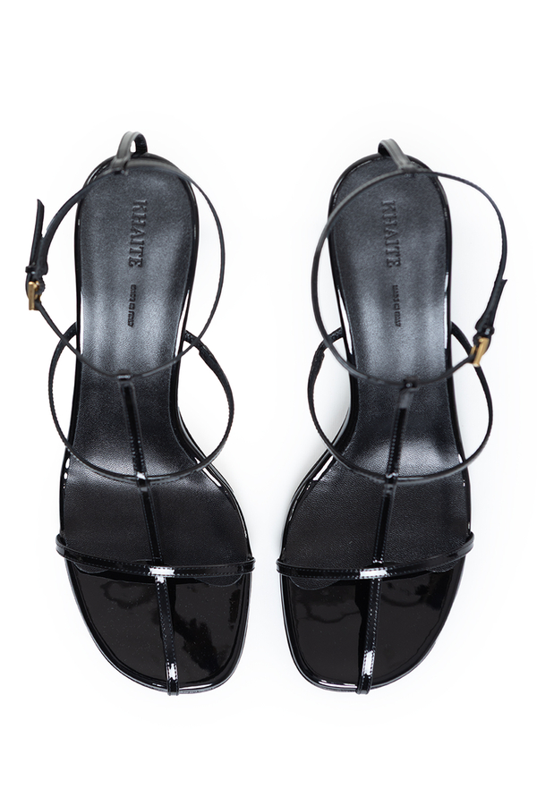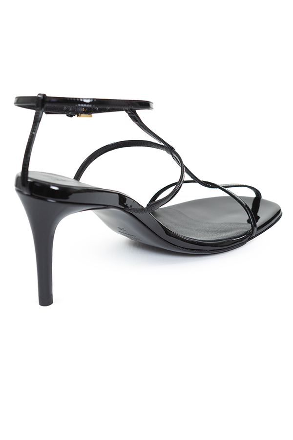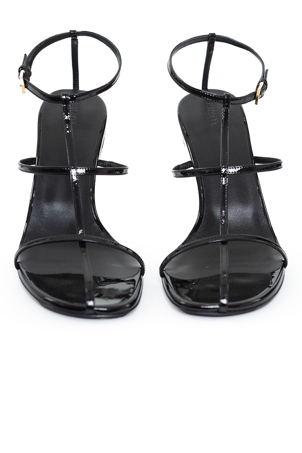 - Босоножки с лакированными ремешками и золотистой пряжкой, открытый закругленный носок, высокий тонкий каблук, фирменная кожаная стелька