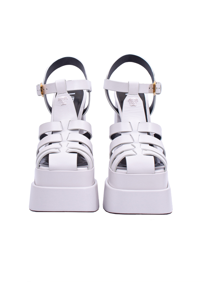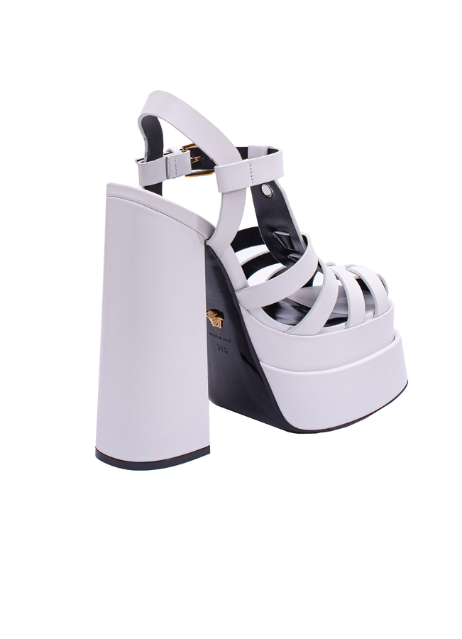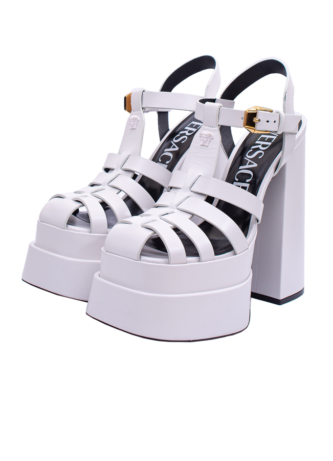 - Босоножки на платформе с пряжками и высоком массивном каблуке. Стелька с логотипом, открытый носок, боковые застежки с пряжками, высокий блочный каблук и золотистая фурнитура.