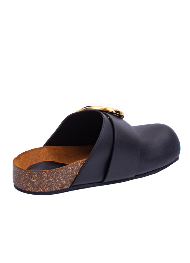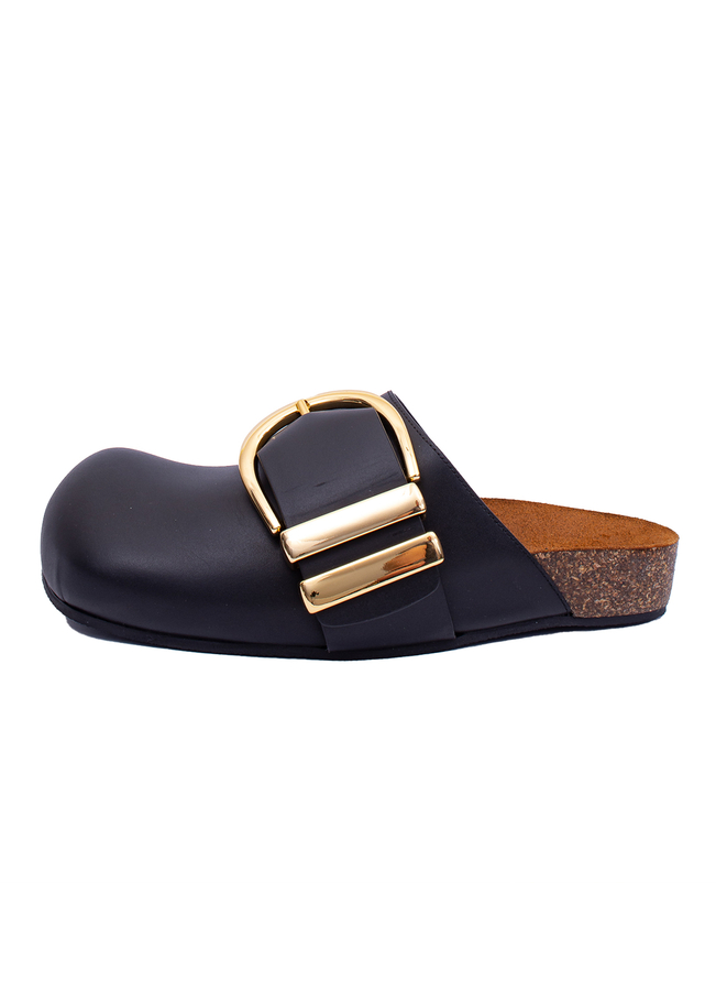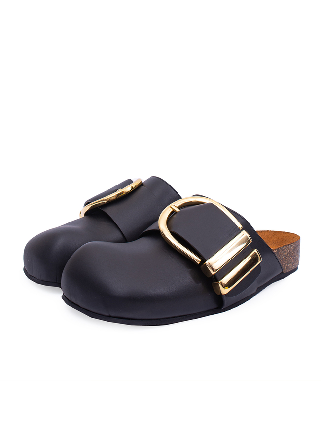 - Кожаные шлепанцы с закрытым носком квадратной формы. Корковая промежуточная подошва и большая декоративная пряжка золотистого цвета. Формованная стелька, резиновая подошва.