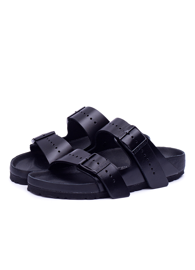 - Кожаные шлепанцы с коллаборацией из Birkenstock. Формованная стелька, открытый носок, браслет с двойным оборотом и застежка на пряжке.
