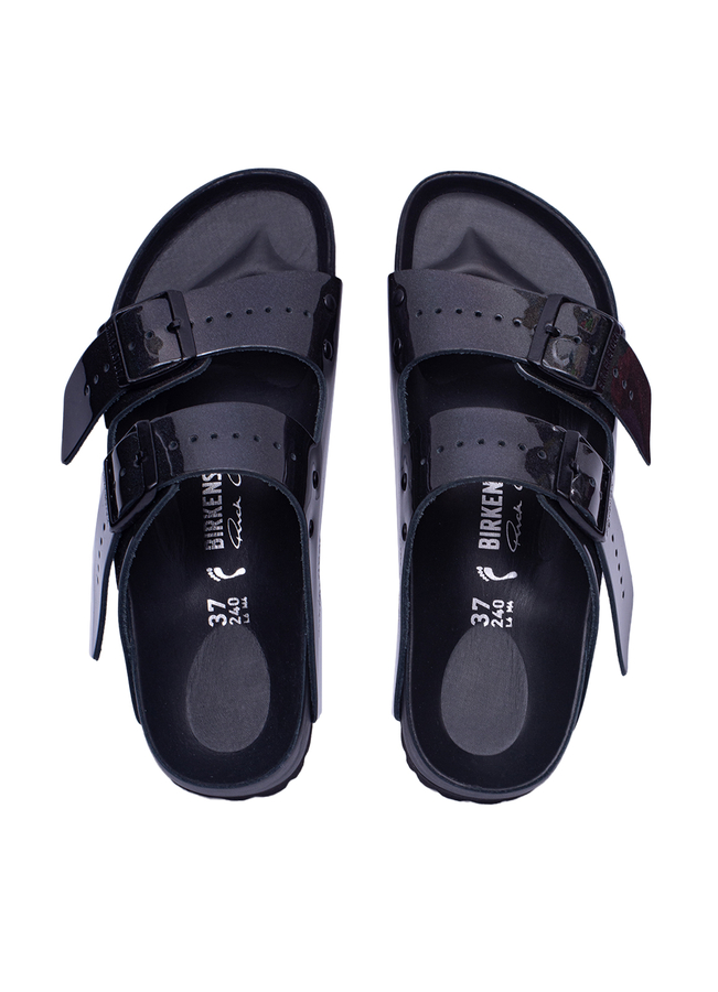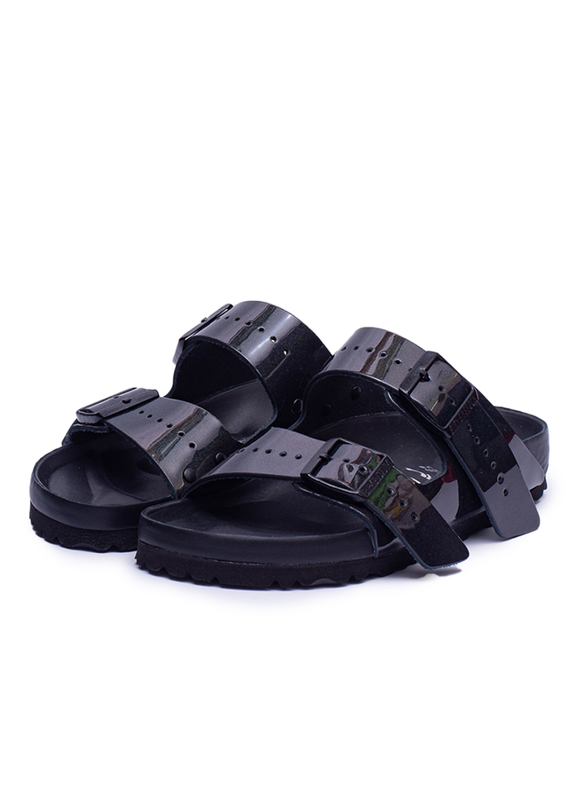 - Лакированная кожа, полированная отделка, выгравированный логотип, открытый палец, крепление с двойной пряжкой, формованное подножие, стили на слипони, резиновая подошва.