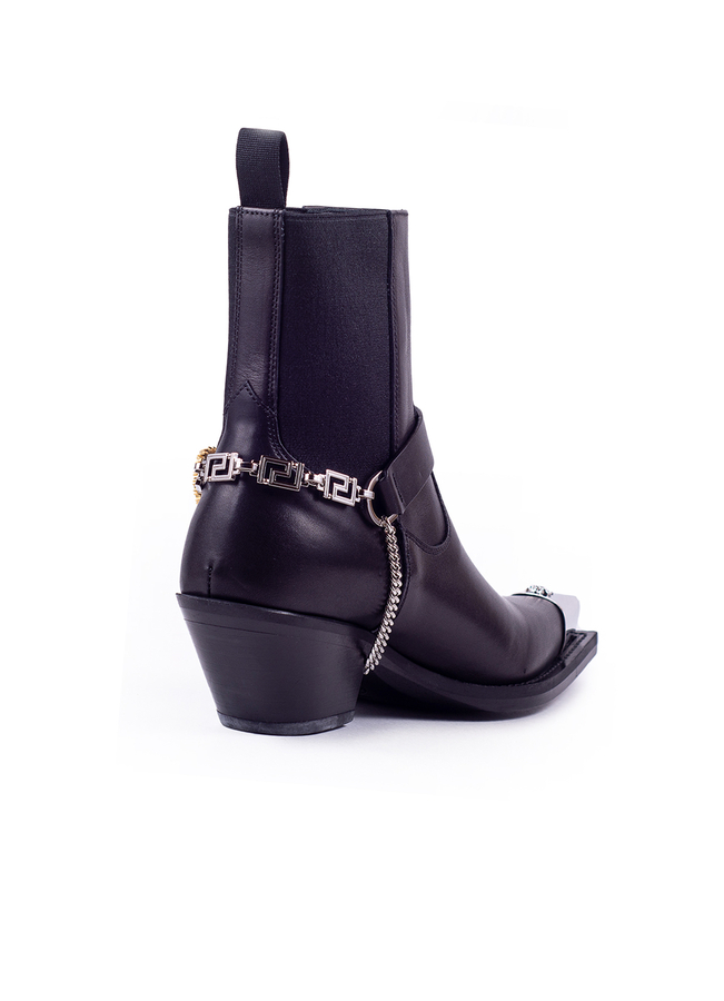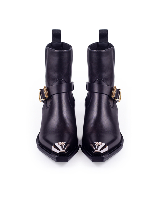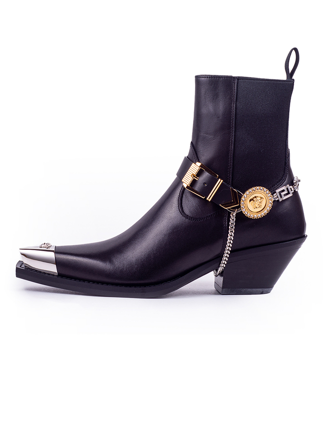 - Кожаные ботильоны с декором «Медуза». Из полированной телячьей кожи, с украшением из металла на заостренных носках. Ремень с пряжкой "Медуза" и цепочка по бокам. Кожаная петля на пятке. Кожаная подкладка. Черный наборный каблук. Кожаная подошва.