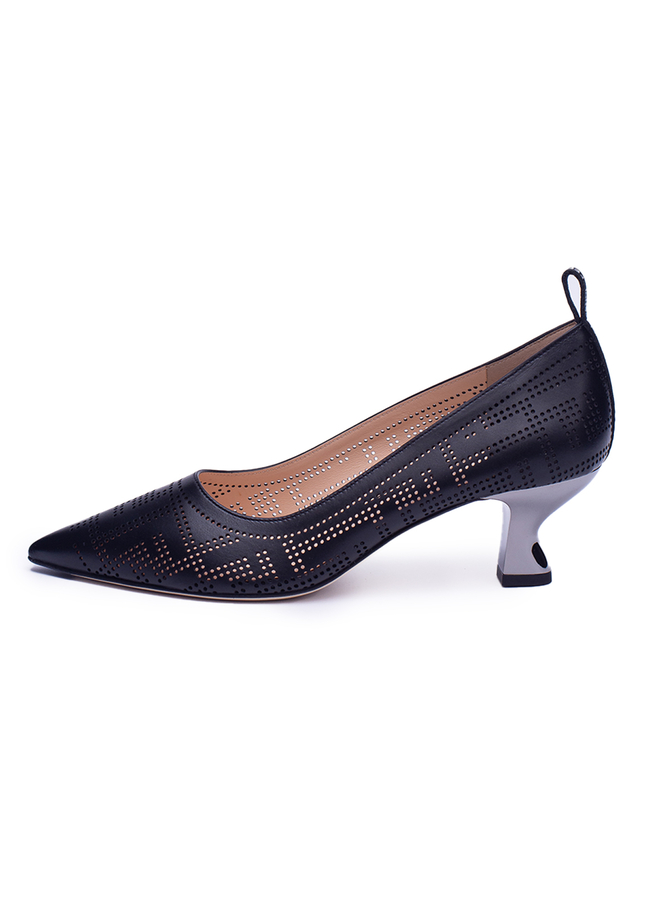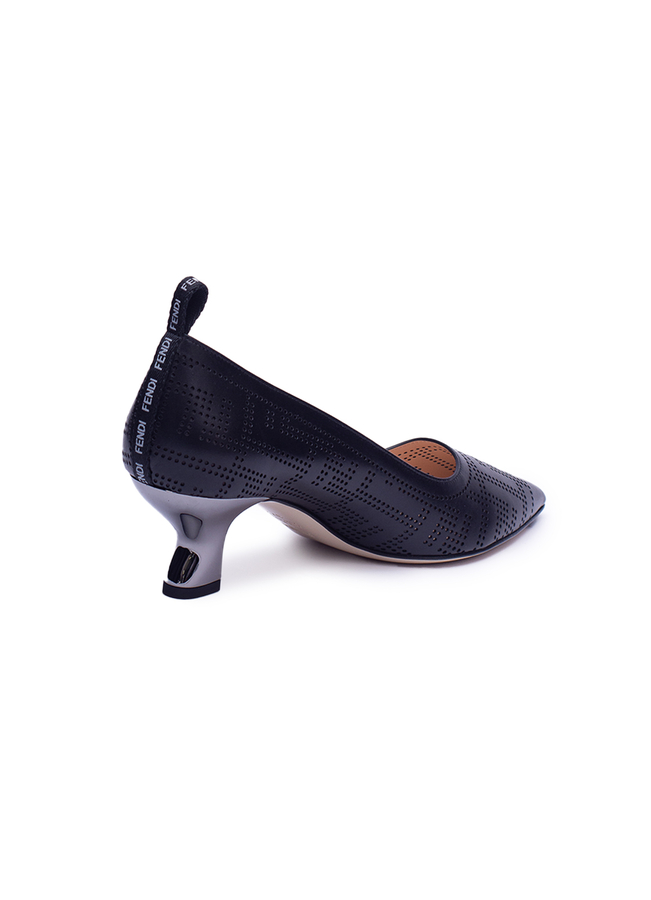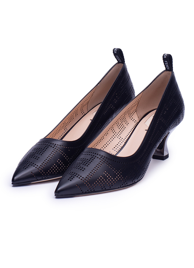- Черные кожаные туфли-лодочки с логотипом на низком каблуке с рисунком-перфорацией FF, заостренным мыском, без застежки, петлей для подтягивания и низким фигурным каблуком.