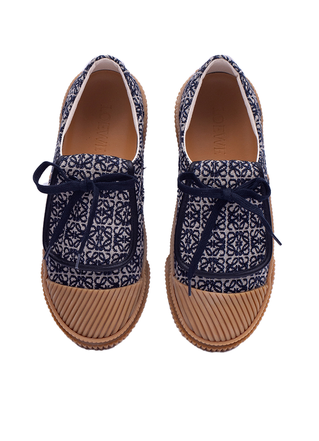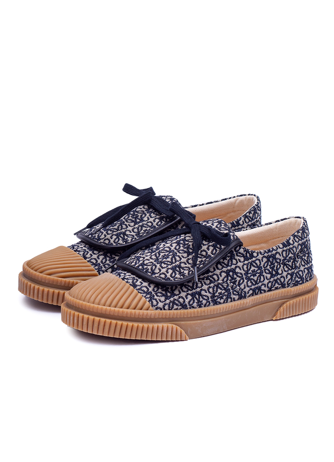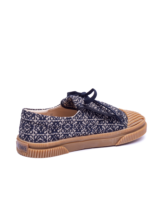 - Кроссовки из жаккарда со шнуровкой, паттерн логотипа по всей поверхности, подошва из вулканизированной резины контрастного цвета и ребристый носок.