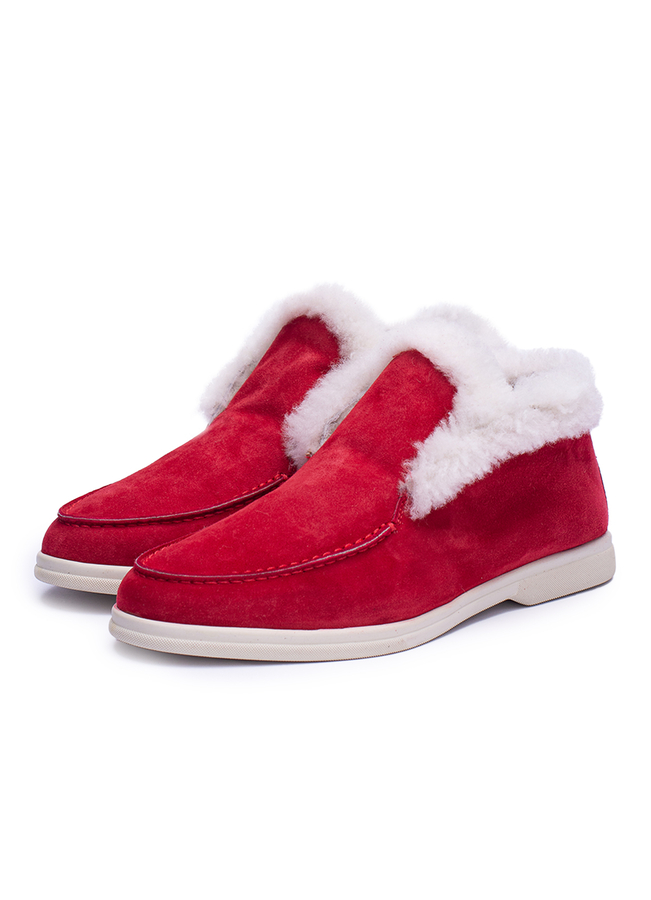 - Замшевые лоферы без застежки, украшенные сверху натуральным мехом. Внутренняя отделка и стелька из натурального меха.