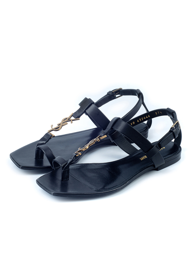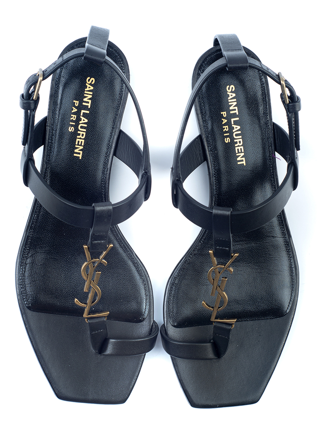 - Черные кожаные сандалии с золотым логотипом YSL впереди. Регулируемый ремешок и пряжка, кожаная подошва.