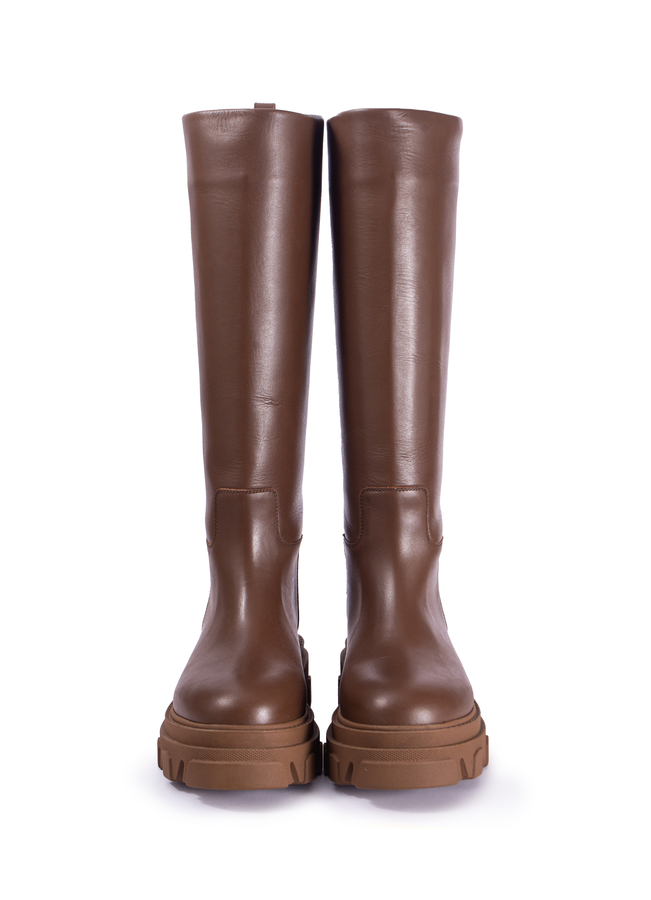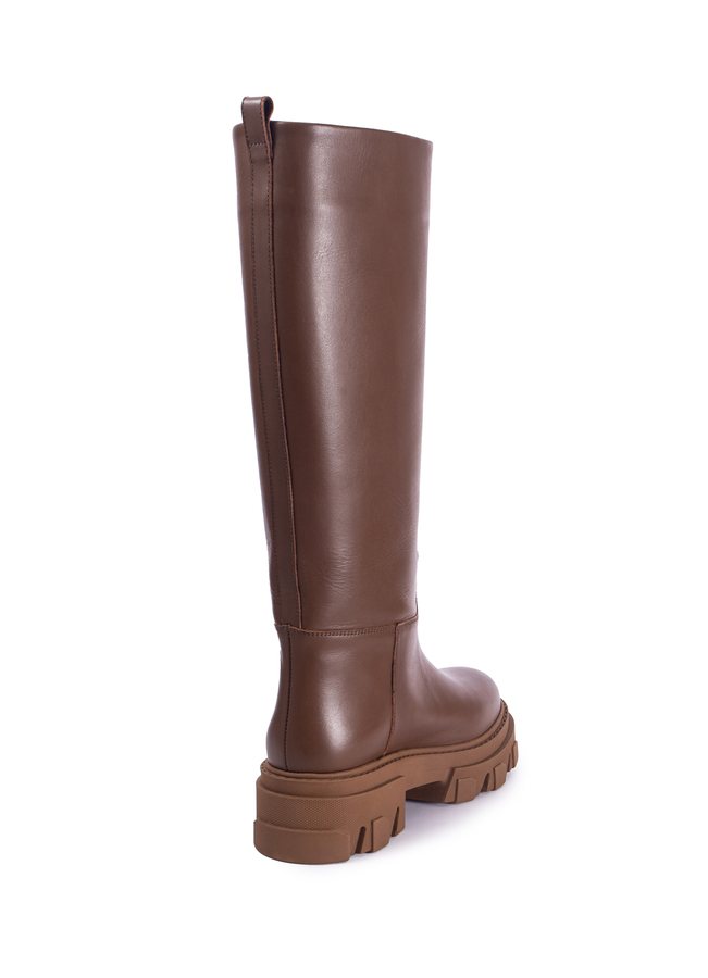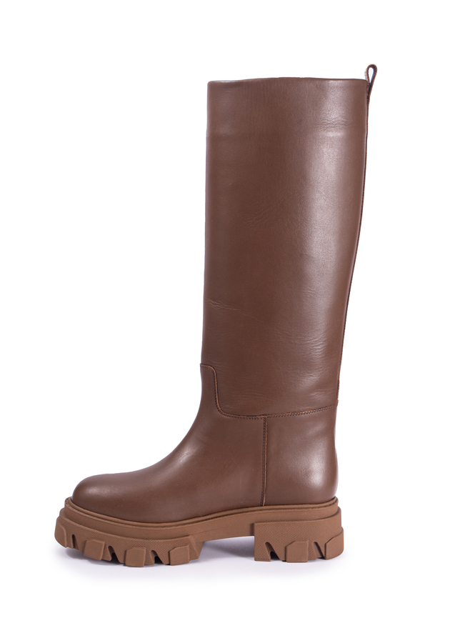 - Сапоги кожаные на толстой подошве. Петля для подтягивания сзади, закругленный носок, без застежки, длина по колено, ребристая резиновая подошва.