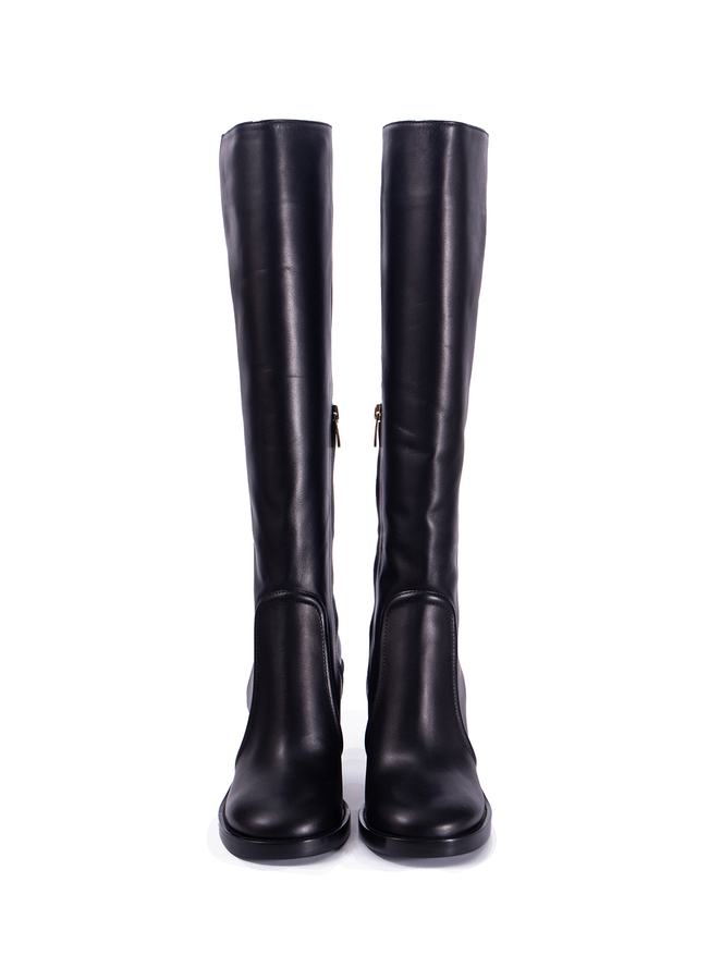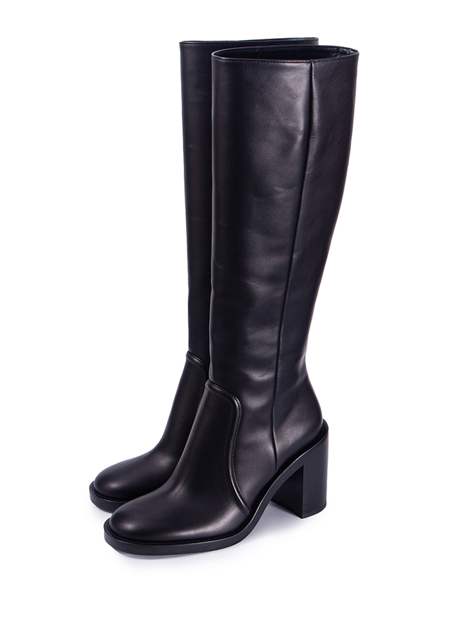 - Кожаные сапоги до колена Conner с круглым носком на массивных наборных каблуках. Застежка на молнии.