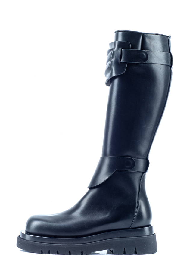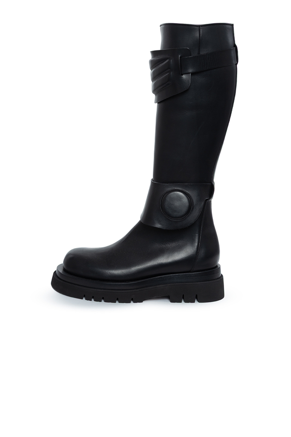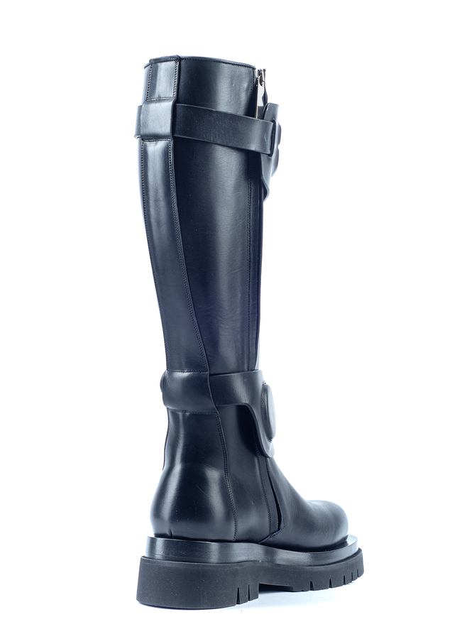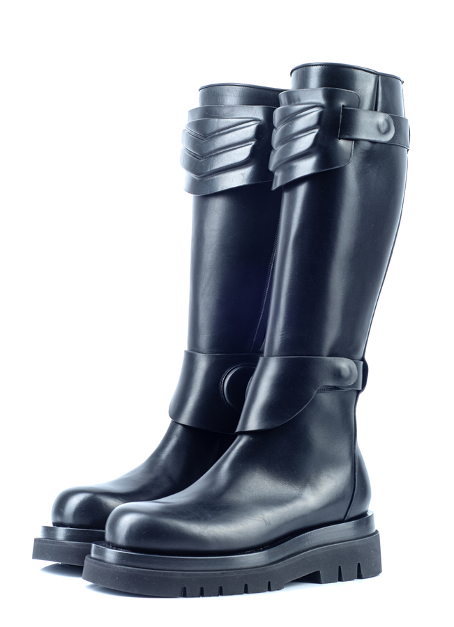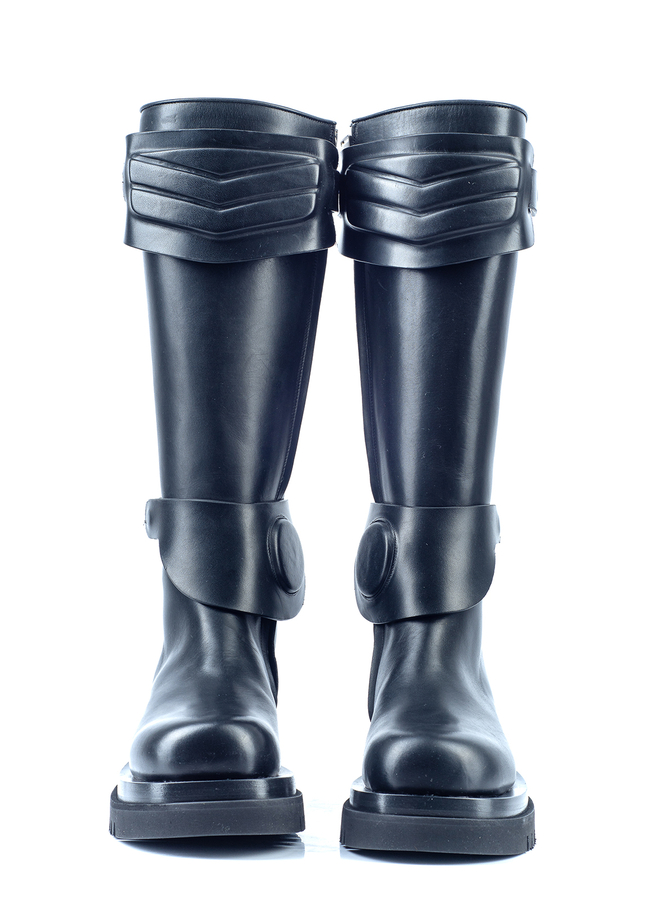 - Черные сапоги на подошве с глубоким протектором, с объемными съемными накладками на широком голенище
