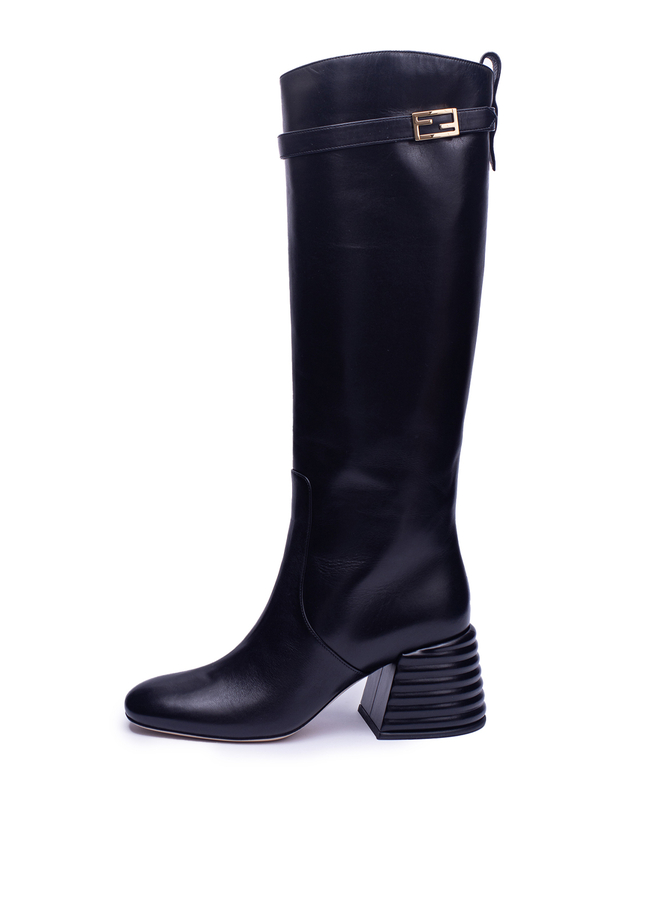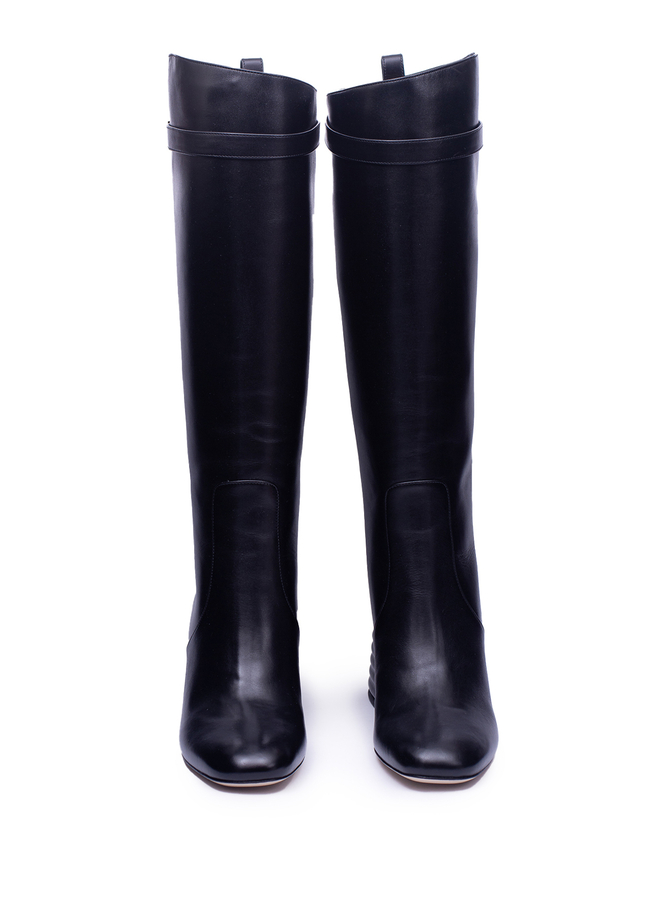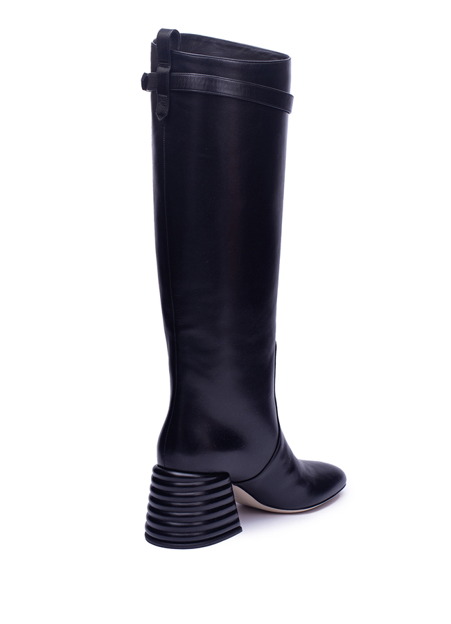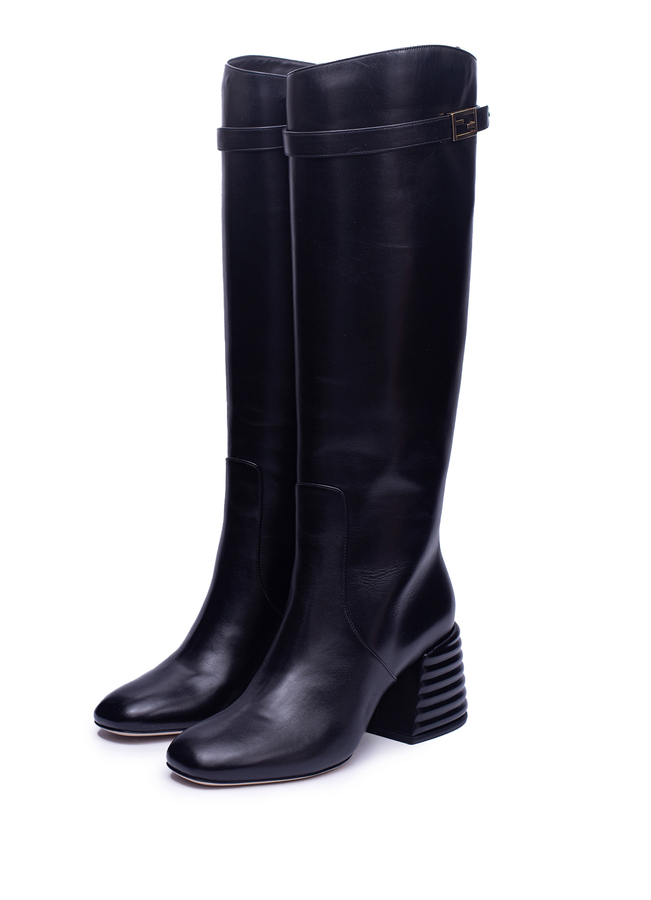 - Высокие кожаные сапоги на фигурном каблуке, пряжка. Низкий наборный каблук, длина по колено, закругленный носок и золотистая фурнитура.
