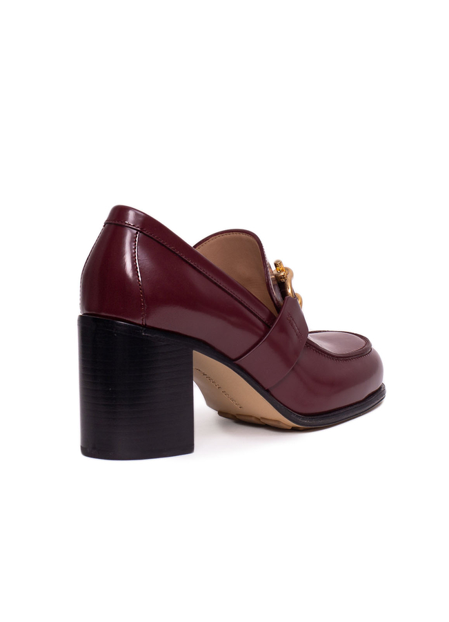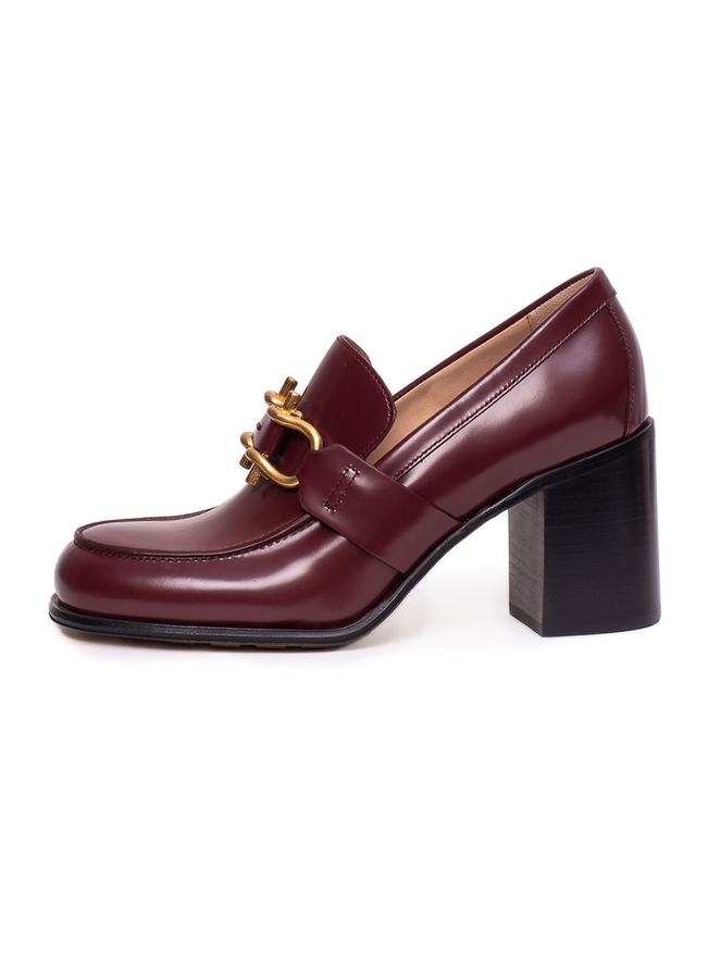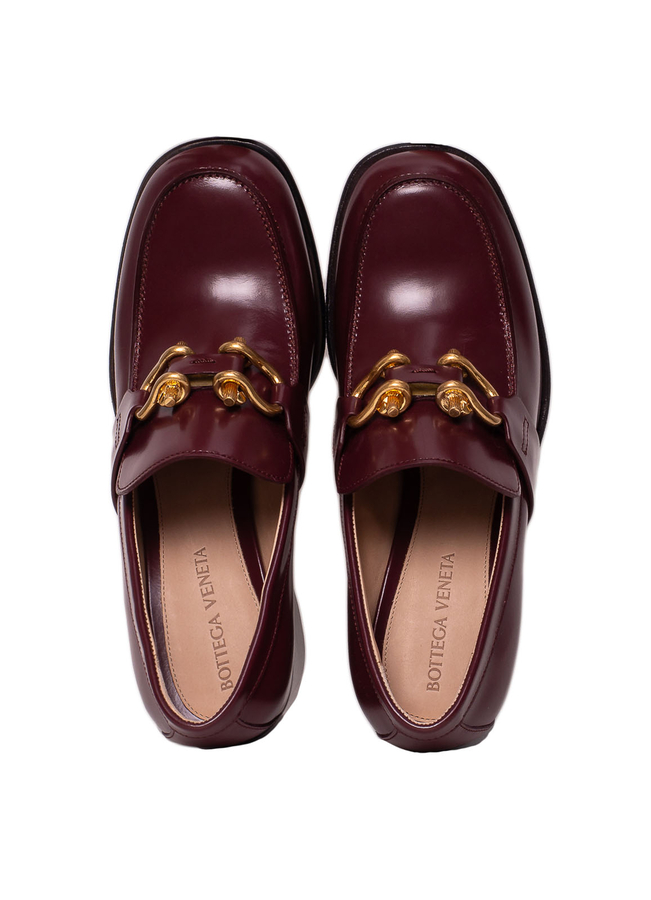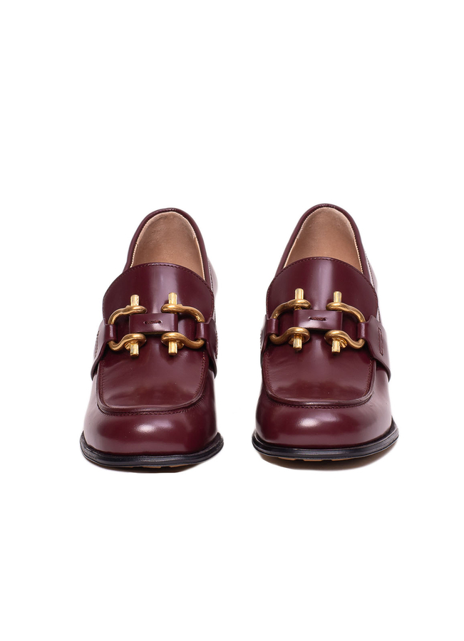 - Кожаные туфли с закругленным носком, широкий каблук, спереди пряжка с золотистой фурнитурой.